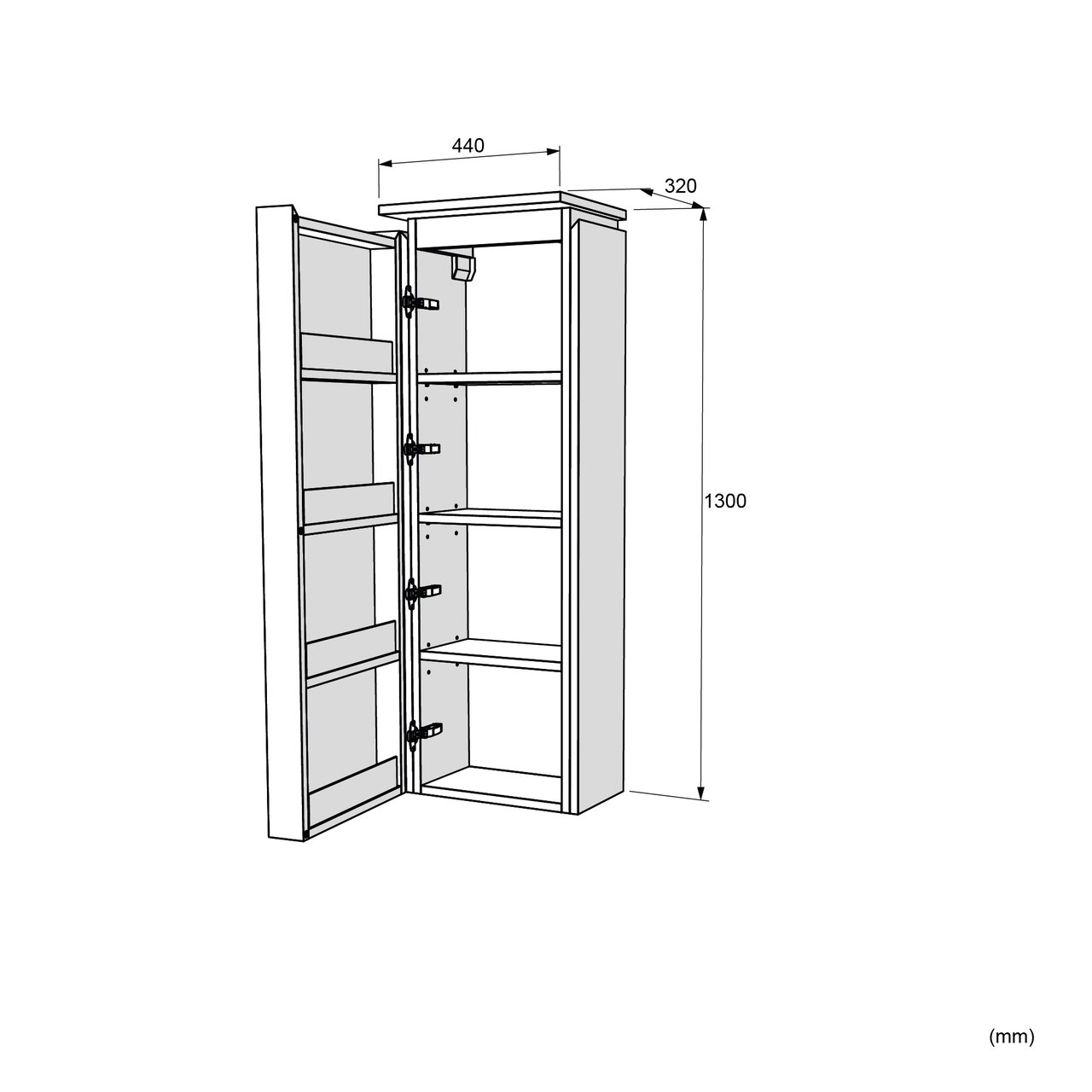Dieser erstklassige, matt lackierte Säulenschrank mit 1 Tür ist 44 cm breit, 130 cm hoch und 32 cm tief. Durch sein geradliniges Design passt dieser hängende Schrank in Sandbeige in jedes Badezimmer.