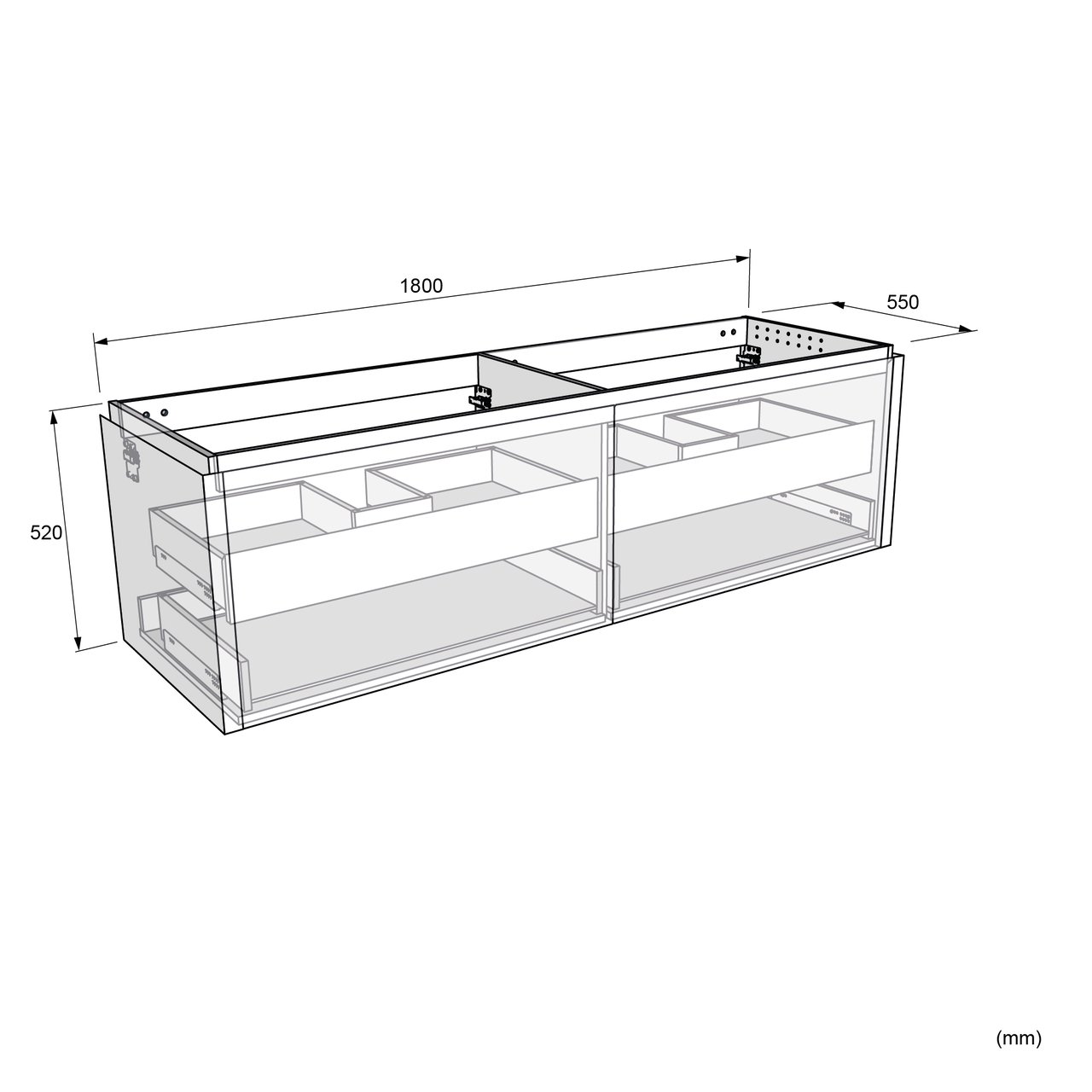 Das Badezimmermöbel ist 180 cm breit und aus Massivholz gefertigt.