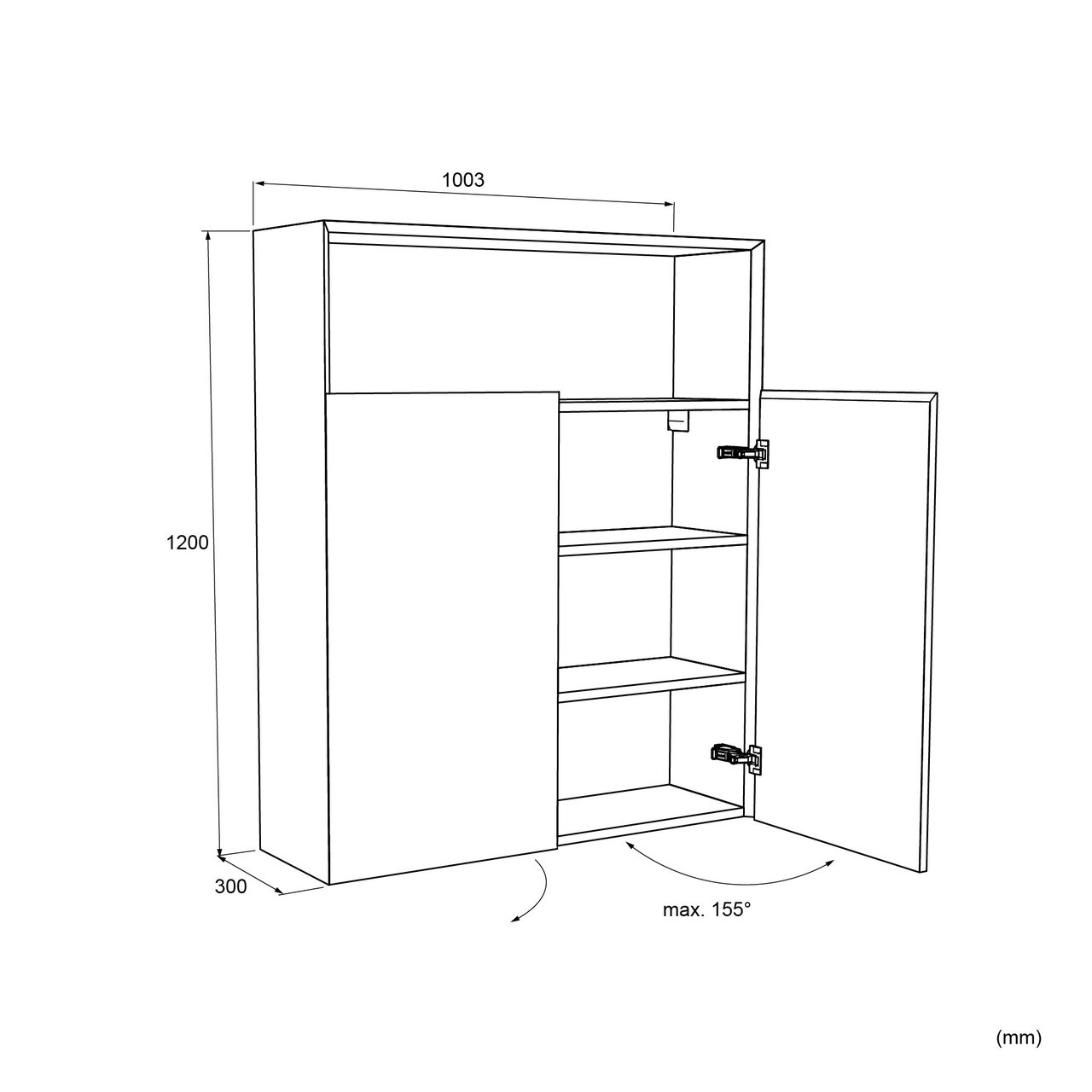 Dieser erstklassige Säulenschrank aus Funier mit 2 Türen hat eine Breite von 100 cm, eine Höhe von 120 cm und eine Tiefe von 30 cm. Dieser Hängeschrank in Natureiche passt dank seiner stilvollen Verarbeitung in jedes Badezimmer.