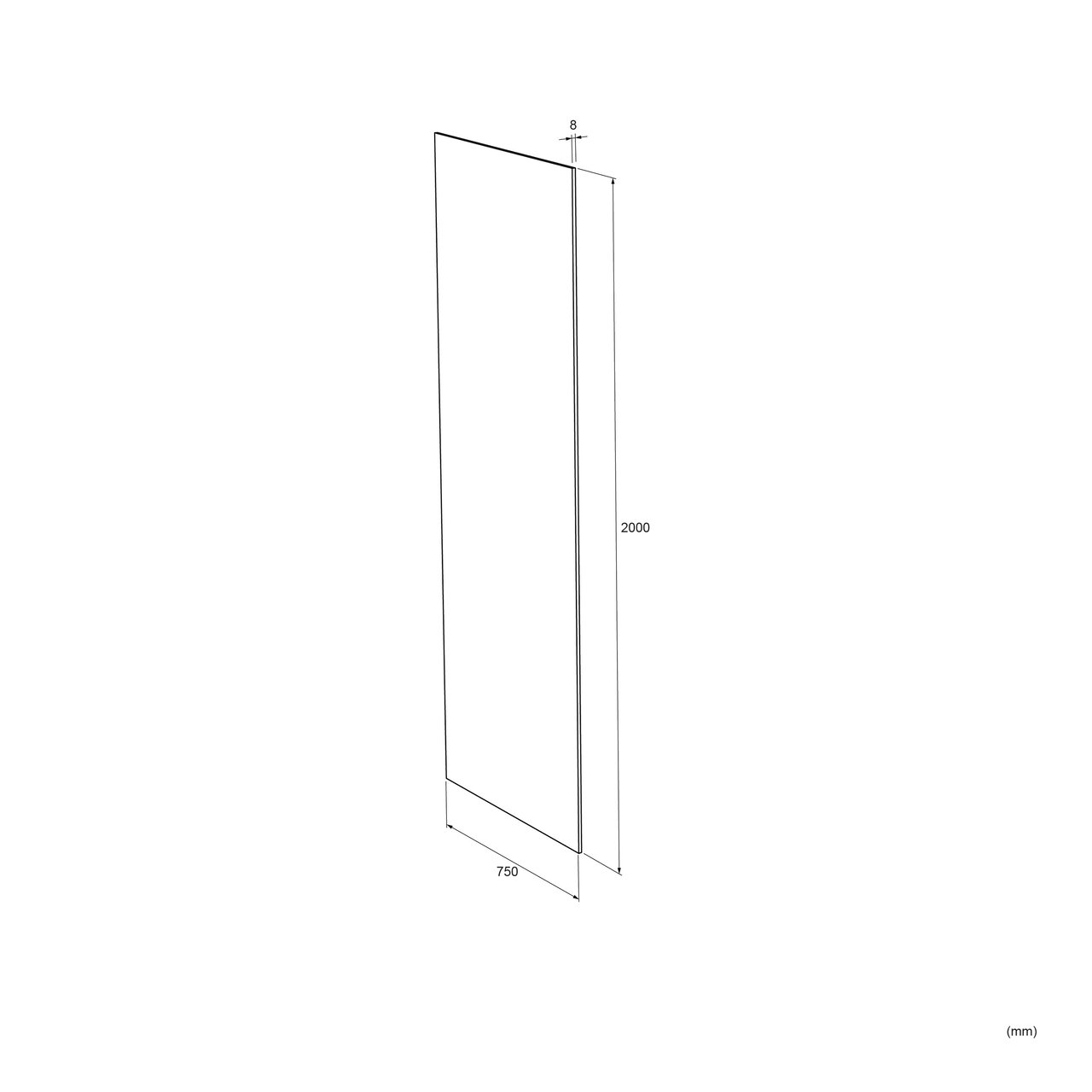 Stilvolles und sicheres Glaspaneel zur Vervollständigung einer Walk-In-Dusche. Dieses Glaspaneel ist 75 cm lang, 200 cm hoch und 8 mm dick.