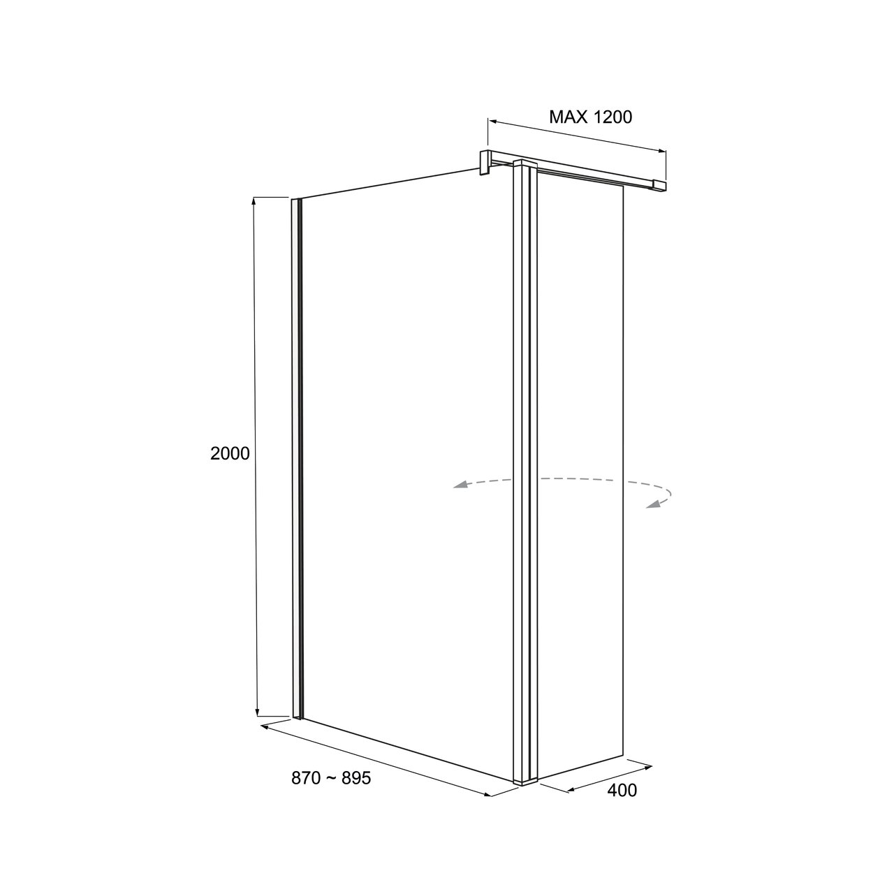 Diese Walk-In-Dusche ist 90 cm lang und 200 cm hoch und hat eine 40 cm breite Seitenwand. Die maximale Tiefe beträgt 120 cm.