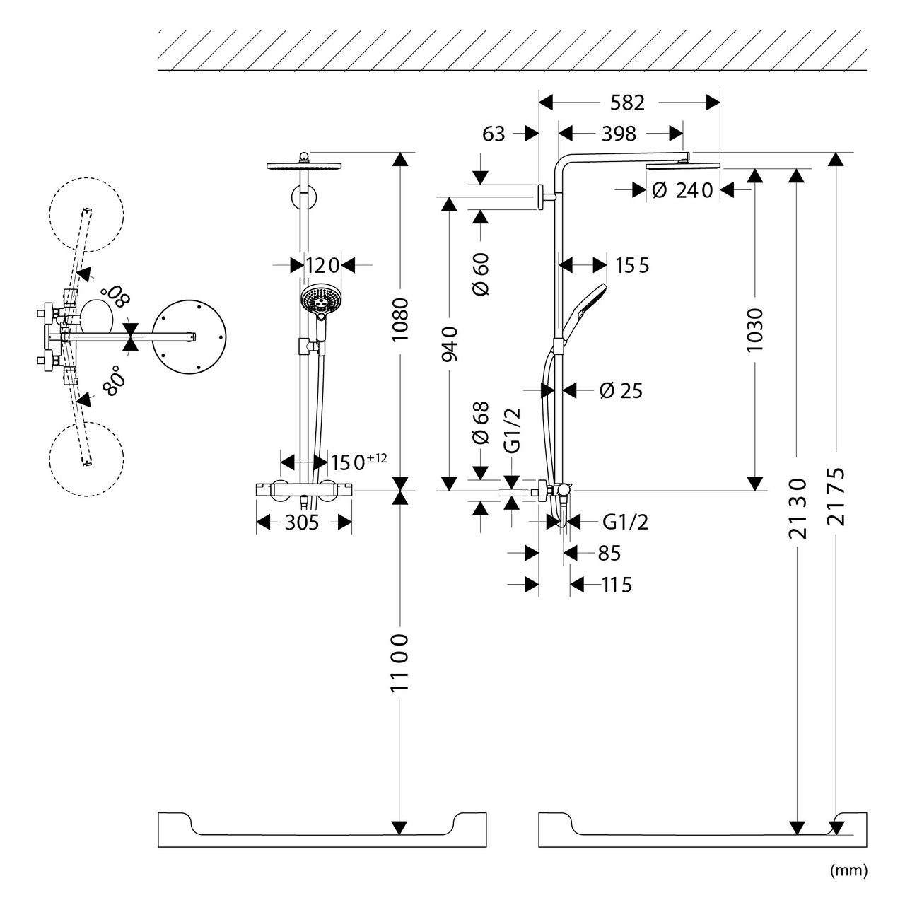 Der Fixierpunkt liegt 94 cm oberhalb der Duscharmatur.