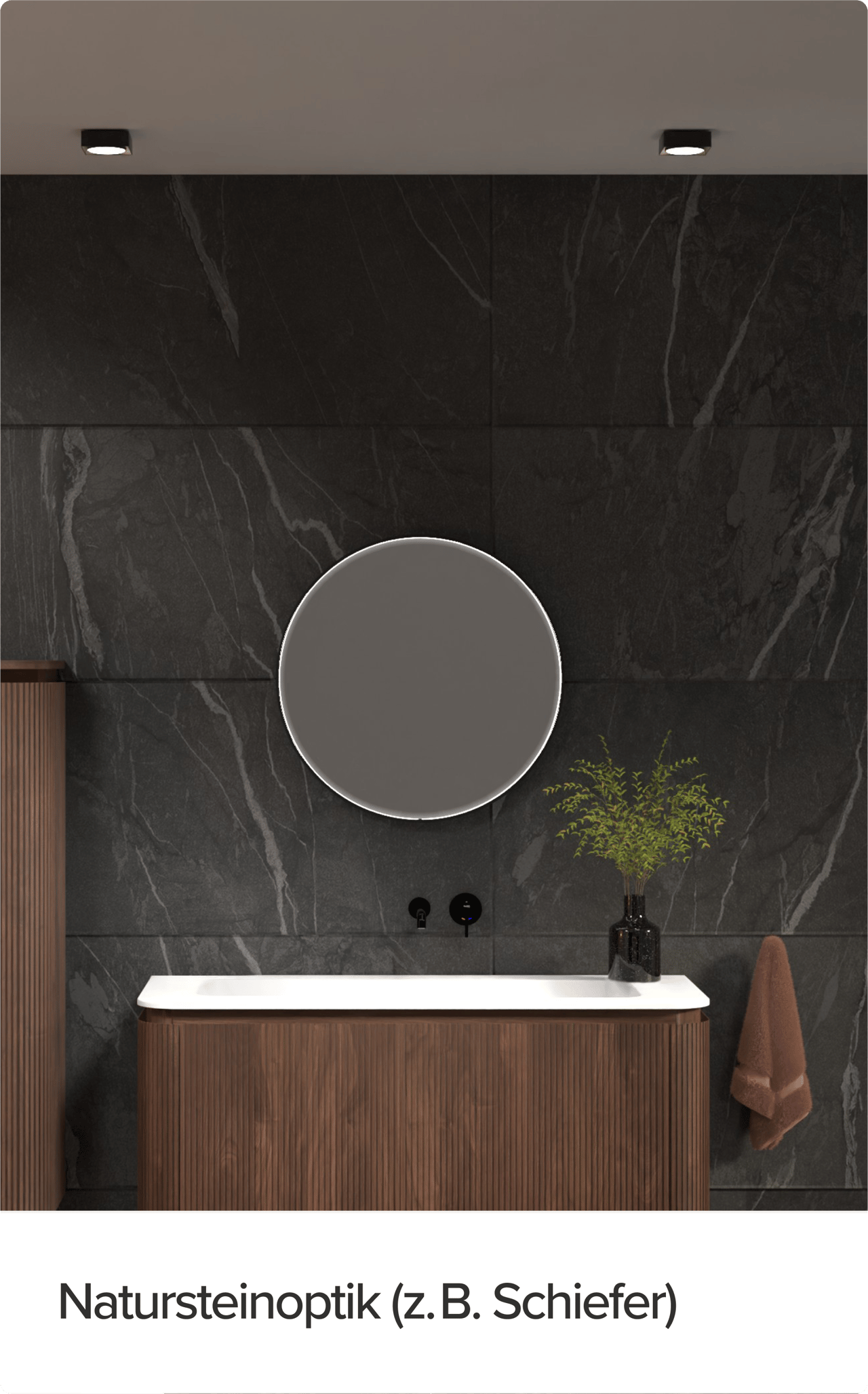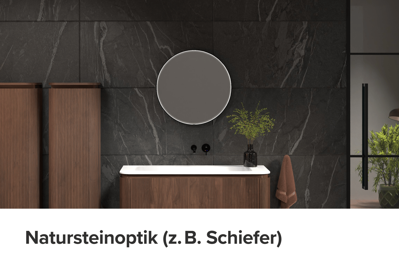 Neben der Farbe spielt auch die Materialwahl für Waschtisch, Duschwandverkleidung oder Möbel eine wichtige Rolle. Entscheide Dich für Materialien mit Wow-Effekt: