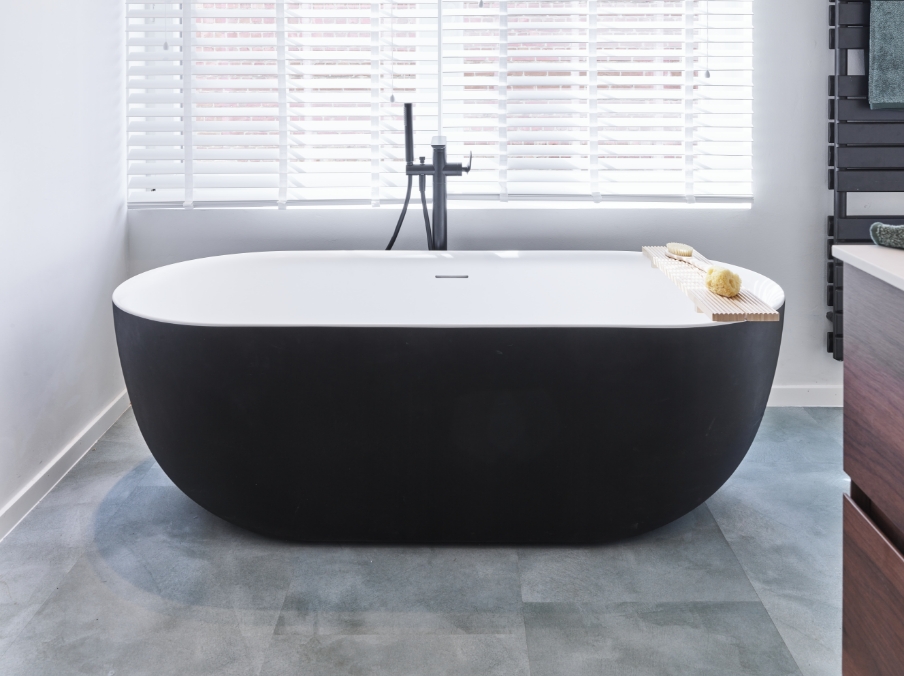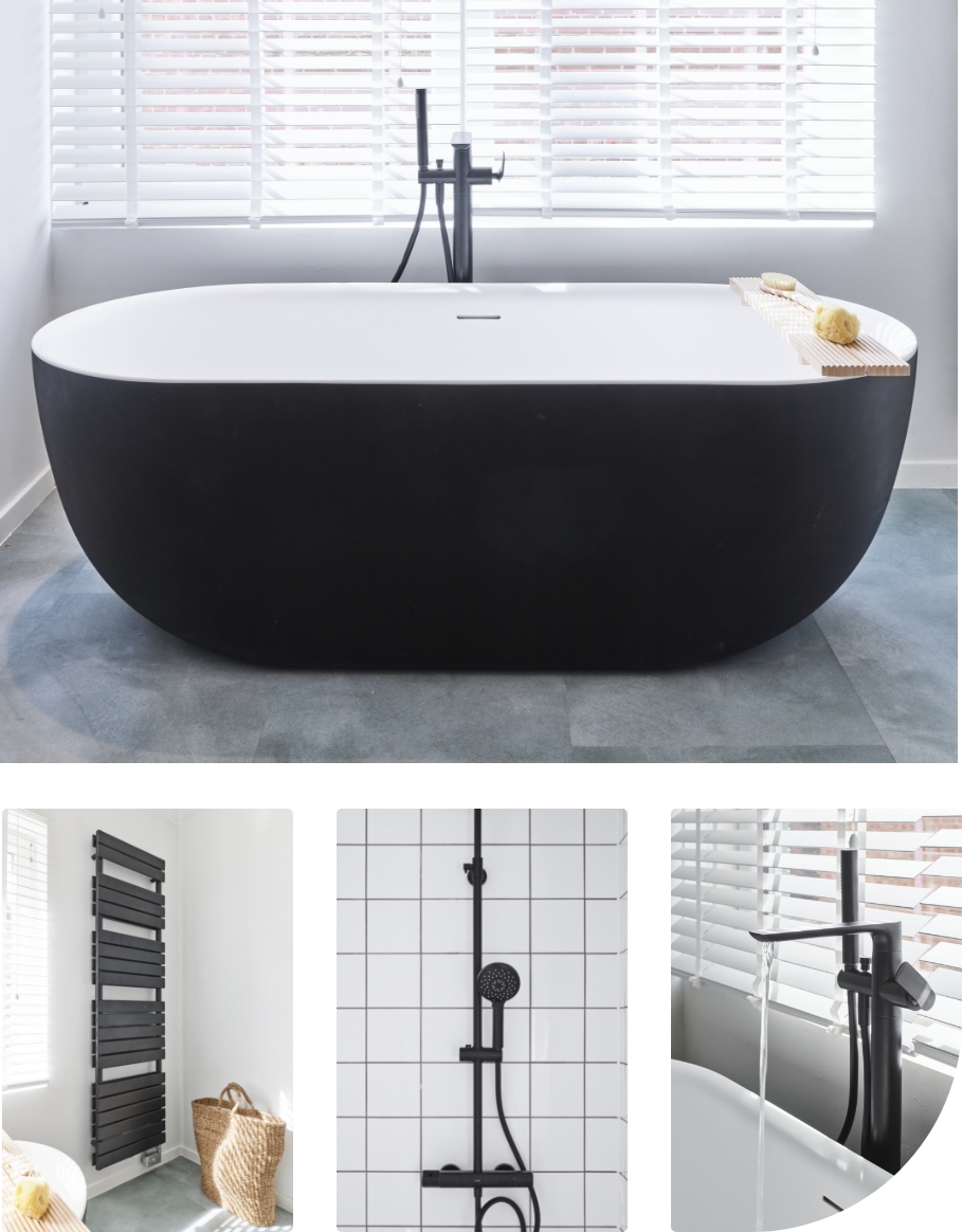 Ein freistehendes Bad war für die Frauen in dieser Familie sehr wichtig. Sie entschieden sich für einen echten Blickfang, nämlich die freistehende, schwarze Luca Varess Mercuria Badewanne. Der dünne Rand und die sanfte Wellenform sind wunderschön. Aufgrund der Form der Badewanne ist sie herrlich bequem für zwei Personen. Durch ihre schwarze Farbe sticht sie zwar ins Auge, fügt sich aber auch gleichermaßen gut in die anderen schwarzen Elemente ein. Das spiegelt sich zum Beispiel in der Armaturenarbeit wider: Die freistehende Blaufoss Expo Badewannenarmatur ist leicht zu bedienen und die Blaufoss Round Einbaumischbatterien am Waschbecken sind schlank, elegant und kompakt. Das Blaufoss Bodan Regenbrause-Set hat sowohl eine Kopf- als auch eine Handbrause mit Temperaturbegrenzer. Vervollständigt wird das Badensemble durch einen Vipera Badheizkörper.