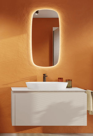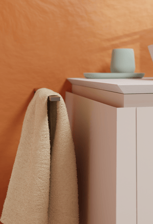 Der Frühling ist in diesem Badezimmer immer präsent! Die orangefarbenen Wände schenken dir jeden Morgen Energie. Das Balmani Eclips-Badmöbel in Sandbeige sorgt für eine weiche, ausgewogene Basis. Gunmetal ist ein tiefgrauer Metallton, der weicher wirkt als Chrom. Die Blaufoss Bodan-Waschtischarmatur und das Bodan-Regenduscheset in Gunmetal passen perfekt zu den warmen Farbtönen dieses Badezimmers. So liegst du voll im Trend.