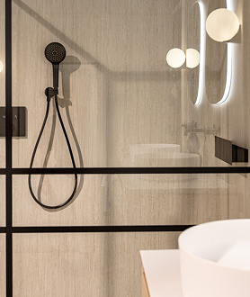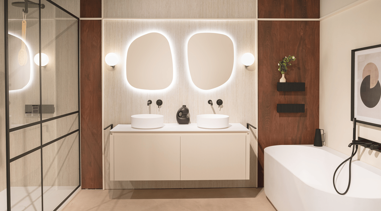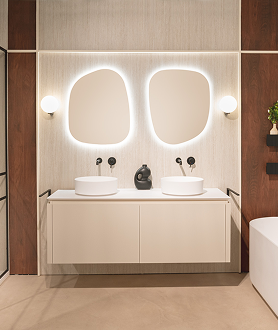 Dieses Badezimmer kombiniert weiche Formen mit starkem Design. Die organisch geformten Spiegel und das sandfarbene Möbel mit feiner Rillenstruktur bringen Wärme en raffinesse. Schwarze Armaturen sorgen für moderne Akzente, während das freistehende Bad und die runden Aufsatzbecken skulptural aanvoelen.