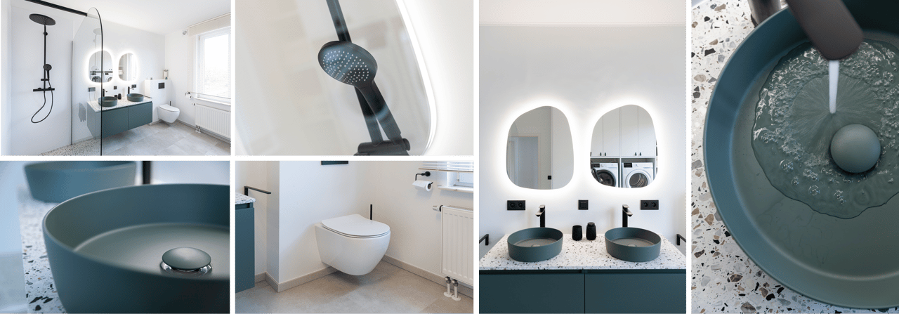 Ein Badezimmer, das Ruhe und Charakter ausstrahlt. Die Kombination aus verspieltem Terrazzo, sanften Grüntönen und klaren schwarzen Akzenten schafft eine ausgewogene und zeitgemäße Atmosphäre. Organische Spiegel mit subtiler Beleuchtung runden das Gesamtbild ab.