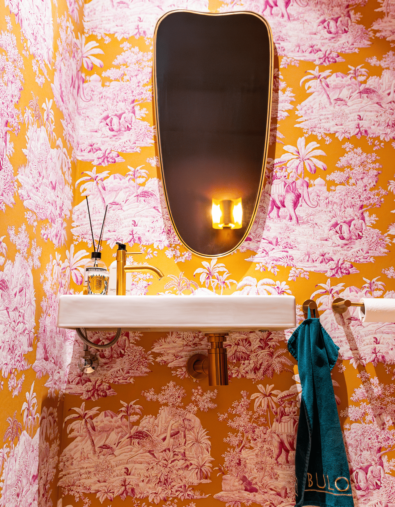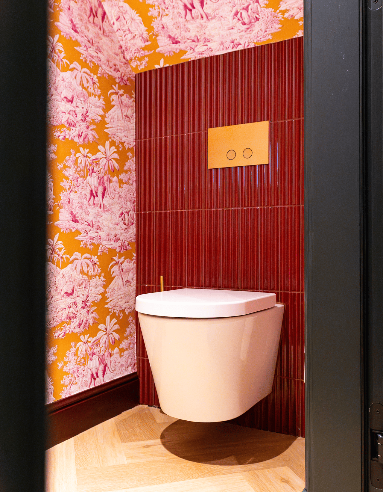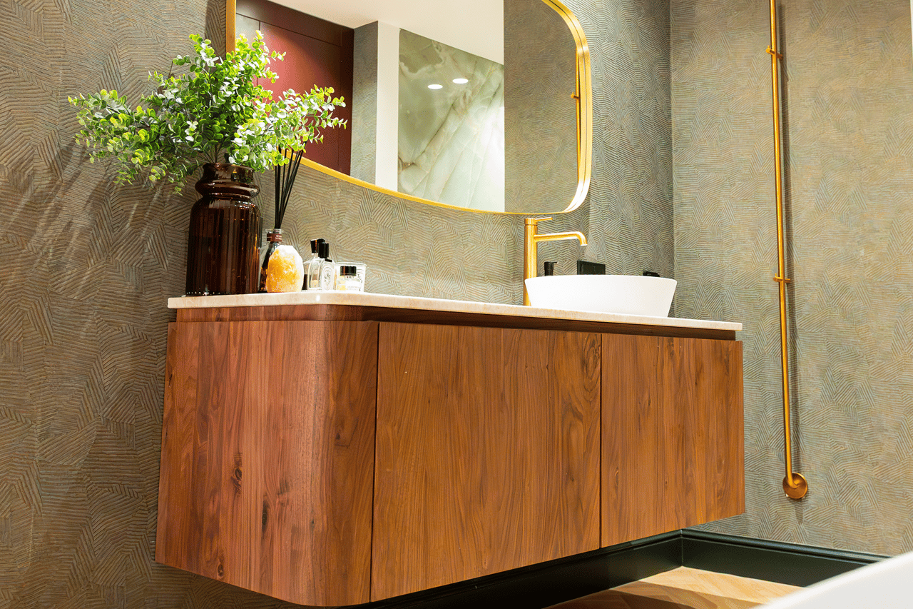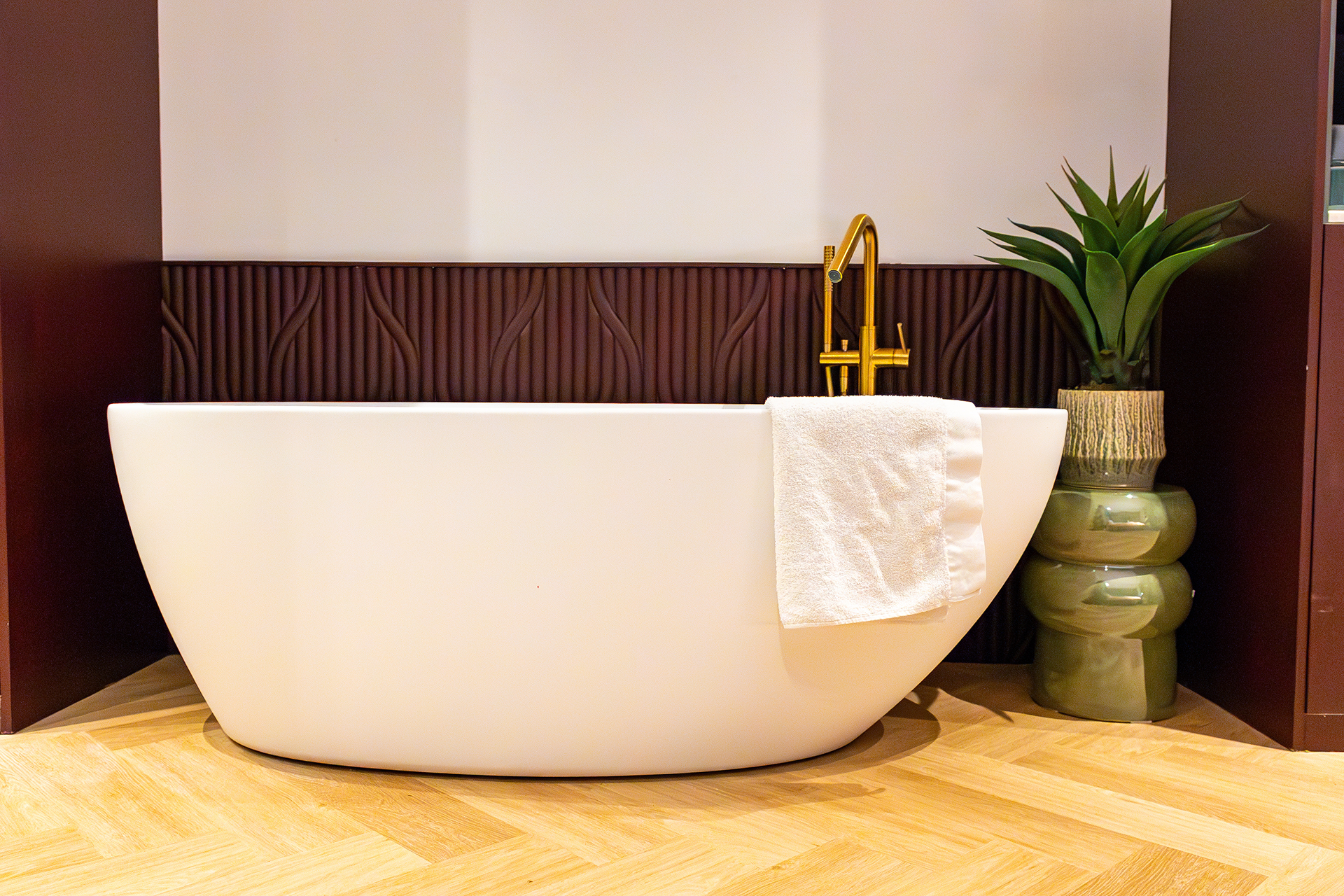 In diesem Badezimmer trifft Stil auf Persönlichkeit. Die tropische Tapete im WC, kombiniert mit tiefem Bordeaux, Gold und Marmor, schafft einen einzigartigen Mix aus Eleganz und Ausdruck. Die freistehende Badewanne mit goldener Armatur ist ein echter Blickfang – harmonisch ergänzt durch warme Materialien und hochwertige Details.