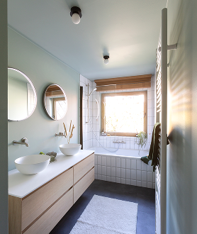 Dieses Badezimmer vermittelt Ruhe durch sanfte Grüntöne, Weiß und helle Holzdetails. Die klare Linienführung und das minimalistische Design schaffen eine offene, beruhigende Atmosphäre. Runde Spiegel und Aufsatzwaschbecken sorgen für eine weiche Note, während weiße Wandfliesen einen dezenten Retro-Charme versprühen.