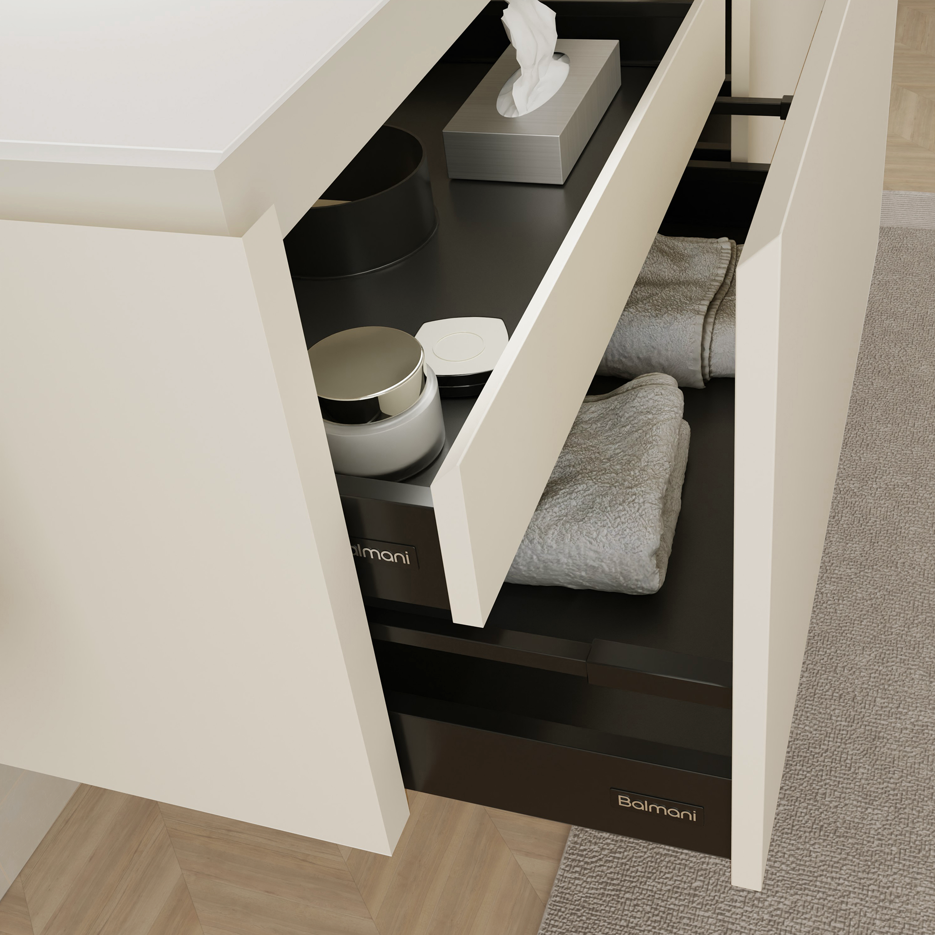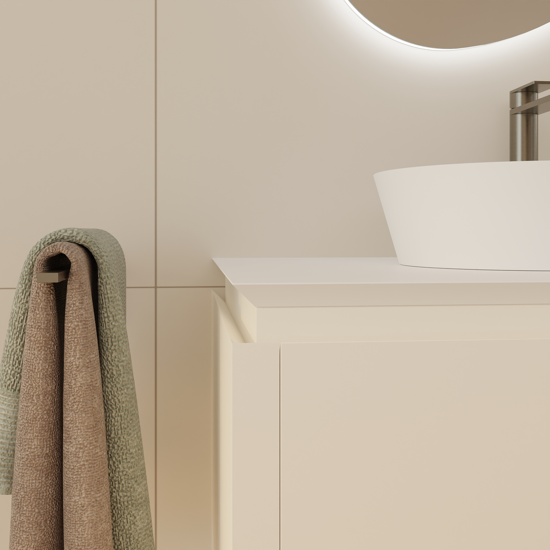 Balmani Eclips Badmöbel Set mit Eclips Waschtischplatte für AufsatzwaschbeckenB90 x T55 cm | Waschbeckenunterschrank Sandbeige | Waschtischplatte in Weiß matt