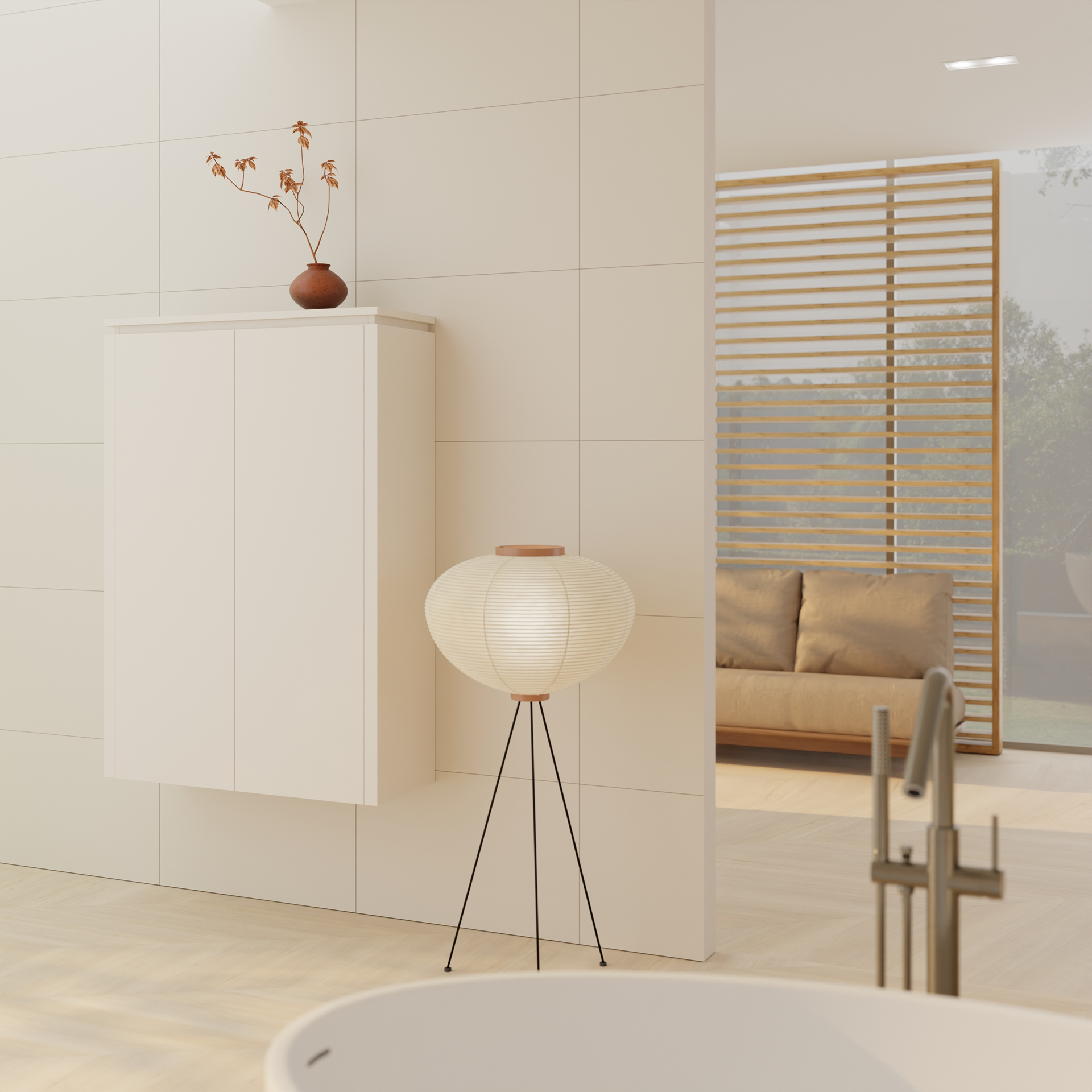 Ein Badezimmer voller Ruhe. Sanfte Beige-Töne, ein schwebendes Möbelstück und organische Spiegel mit Licht schaffen eine warme, minimalistische Atmosphäre. Japanische Schlichtheit trifft nordische Geborgenheit.