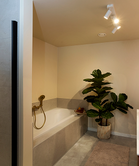 Dieses Bad verbindet weiche Eleganz mit modernem Luxus — ein warmer Kokon zum Wohlfühlen.