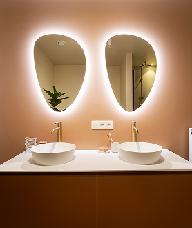 ✔ Organische Formen – Spiegel und Waschbecken sorgen für einen verspielten, eleganten Look.