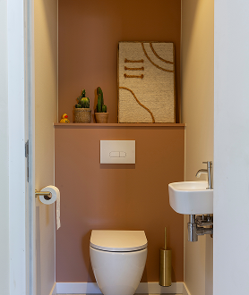 Ein Badezimmer, in dem sanfte Erdtöne auf subtile Luxusakzente treffen. Warme Rostfarben, goldene Armaturen und organische Spiegel verleihen dem Raum eine einladende, stilvolle Note. Pflanzen, Naturmaterialien und weiche Formen schaffen ein harmonisches Gesamtbild voller Ruhe und Wärme.