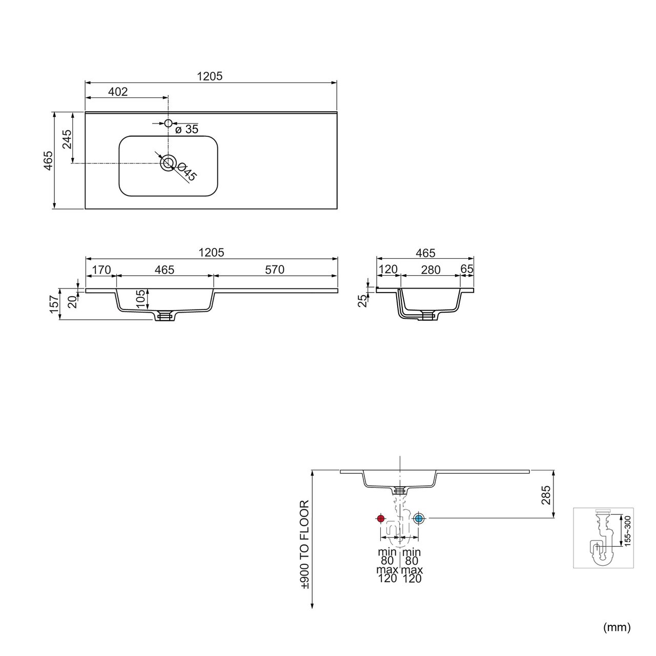 | Einzelne oder Doppelwaschbecken | Linksseitiger Waschtisch | |