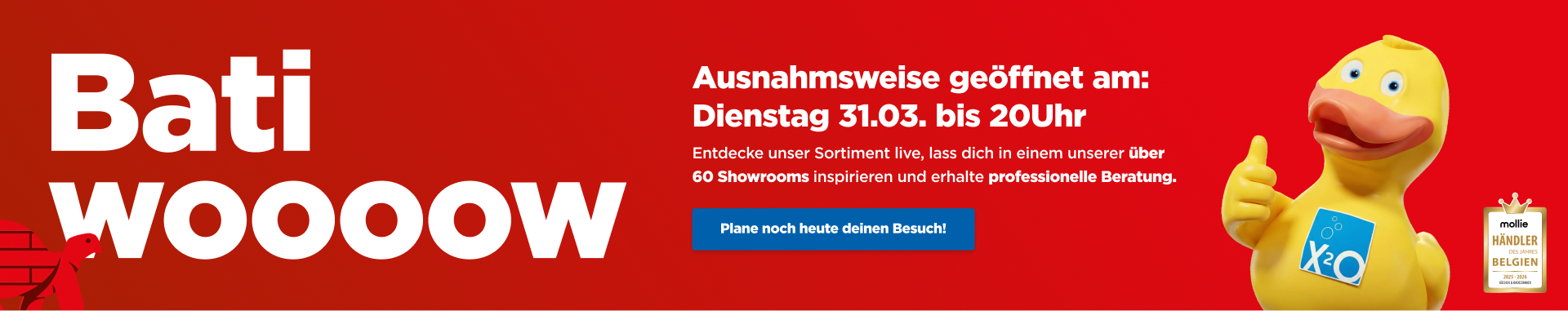 Mit mehreren Badausstellungen und Sanitär-Showrooms in Belgien findest du immer eine X²O Badezimmer Ausstellung in deiner Nähe. Unsere Badezimmereksperten stehen bereit, um dir bei der Verwirklichung deines idealen Badezimmers zu helfen. Komm vorbei und sieh dir unsere stilvollen Badlösungen live an. Entdecke dein ideales Badmöbel, deine Regendusche, deine Badewanne oder dein WC bei der Badezimmerausstellung in deiner Nähe.