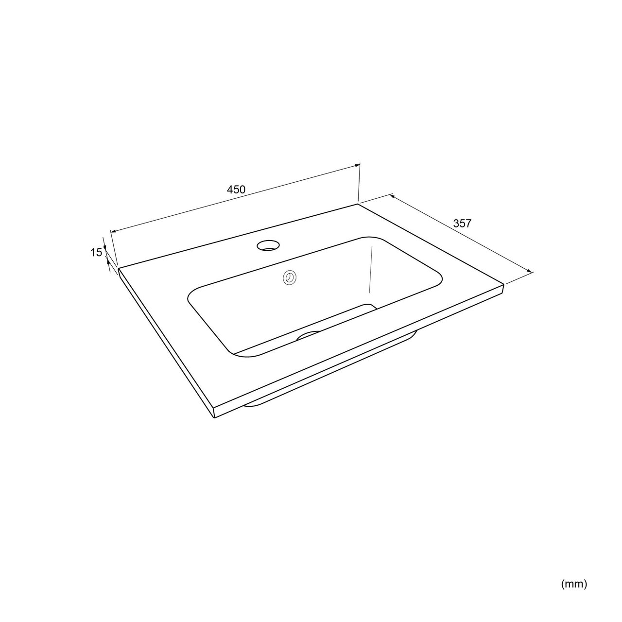 Dieser Waschtisch aus Komposit mit integriertem Aufsatzbecken ist 45 cm breit, 35 cm tief und hat eine Randhöhe von 1,5 cm. Dieser mattglänzend weiße Waschtisch zeichnet sich durch ein minimalistisch-zeitgemäßes Design aus, mit dem er sich nahtlos in jedes Badezimmer einfügt.