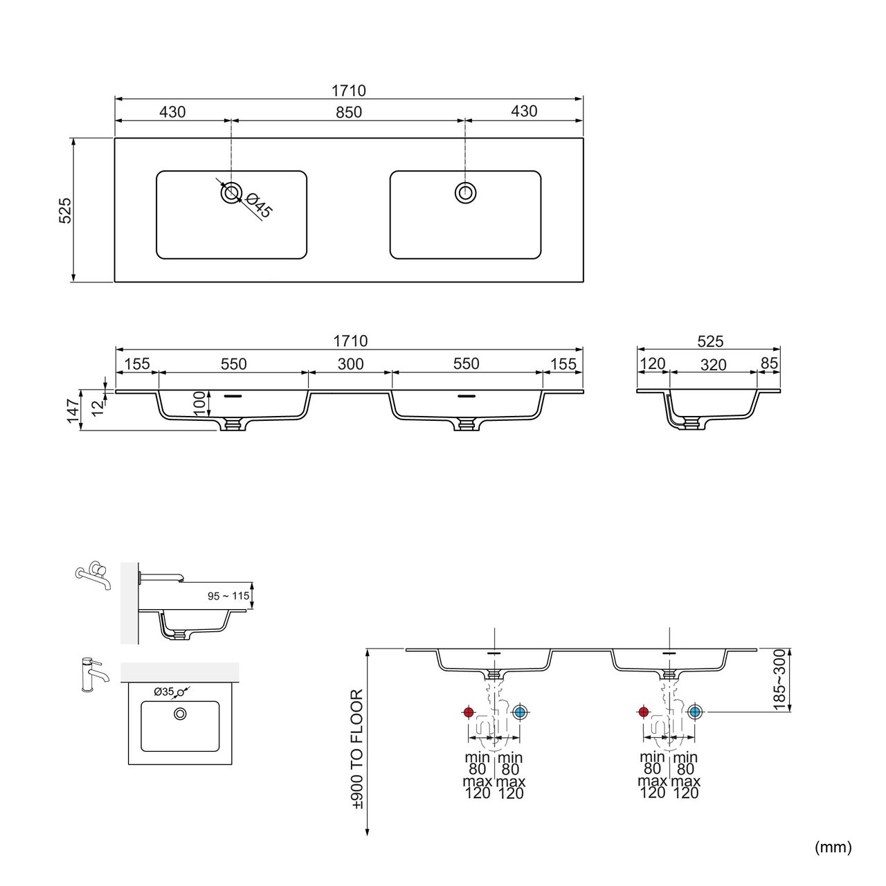 Maße | 170 x 52 cm Doppelwaschtisch | |