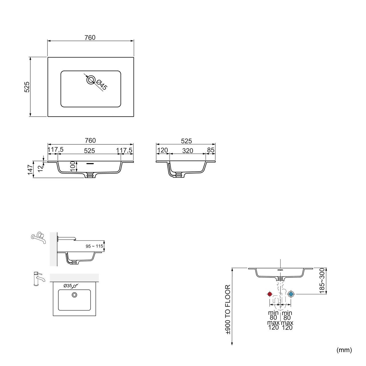 Dieser Waschtisch ist auch in anderen Abmessungen, in einer Variante mit zusätzlichem Ablaufstopfen und in einer Variante mit Randhöhe 9 cm erhältlich.