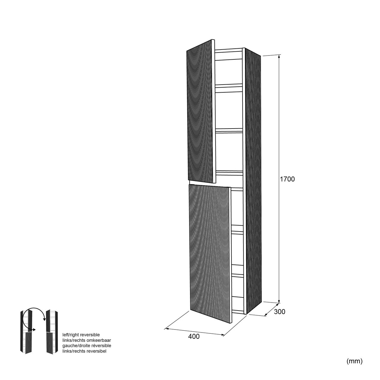 Dieser Säulenschrank mit MDF mit PVC-Folie und 2 Türen ist 40 cm breit, 170 cm hoch und 30 cm tief. Durch sein geradliniges Design passt dieser hängende Schrank in Nussbaum in jedes Badezimmer.