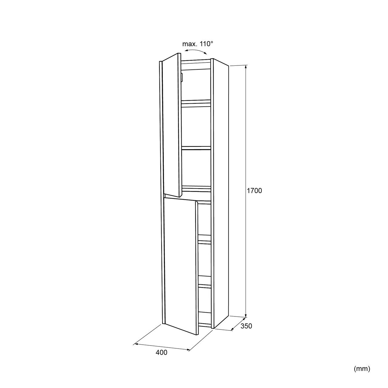 Dieser MDF lackierte Säulenschrank mit 2 Türen hat eine Breite von 40 cm, eine Höhe von 170 cm und eine Tiefe von 35 cm. Der Hängeschrank in Weiß matt passt durch seine gerade Form in jedes Badezimmer.
