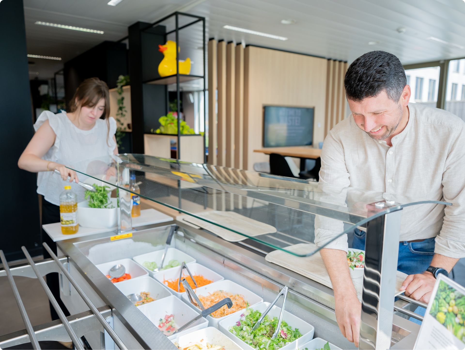 Au fil des années, l’entreprise a grandi avec Robby et Samuel. Mais la culture de collaboration, le plaisir au travail et les déjeuners partagés sont restés inchangés. Cela se ressent même dans la cafétéria du siège à Gand. Ce qui avait commencé comme une simple idée pour « faire un peu plus pour l’équipe » est aujourd’hui devenu une valeur sûre de partage et de convivialité – avec des repas frais chaque jour, un salad bar et des spaghettis bolognaise d’un niveau culinaire supérieur.