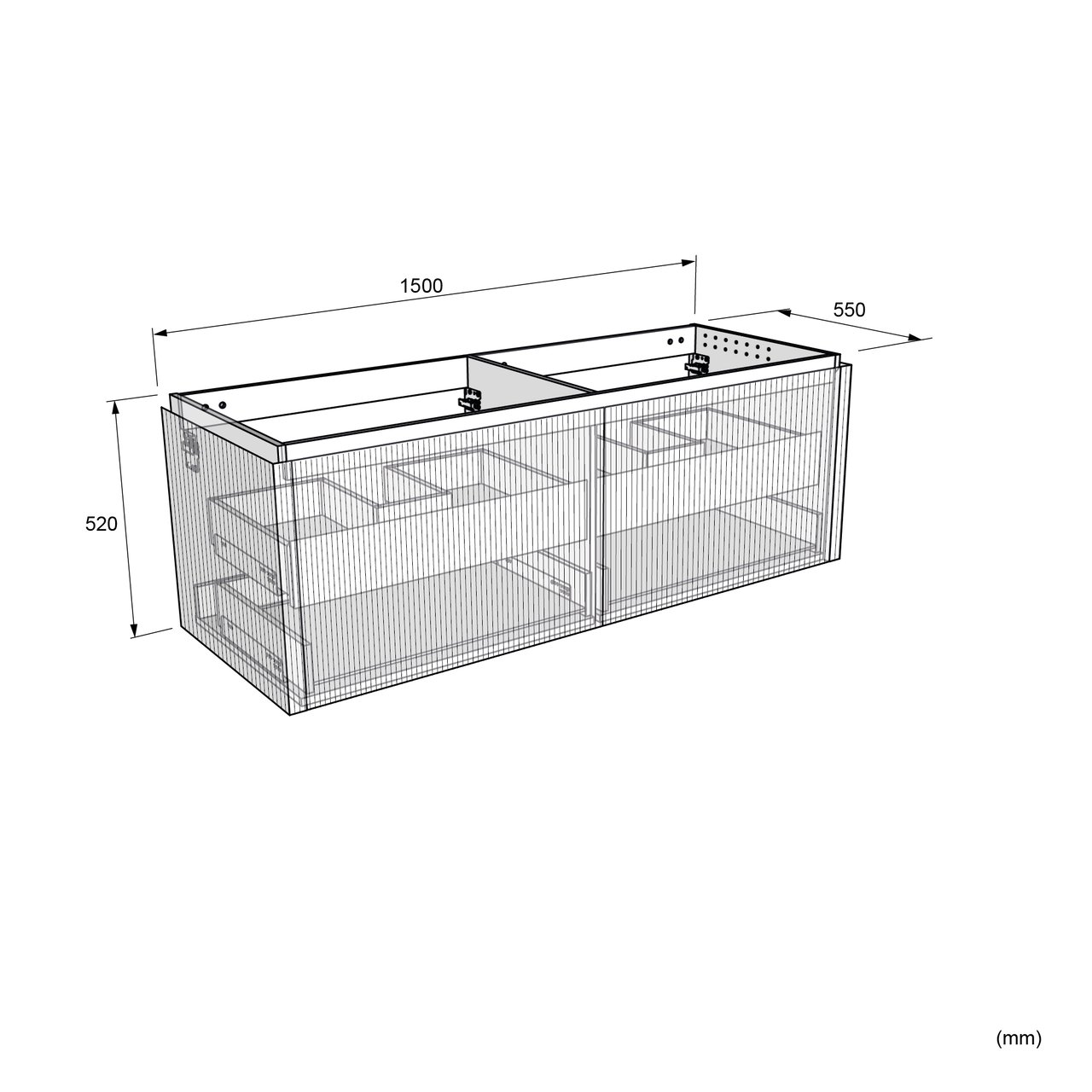Le meuble de salle de bains fait 150 cm de large et il est fabrique en bois massif.
