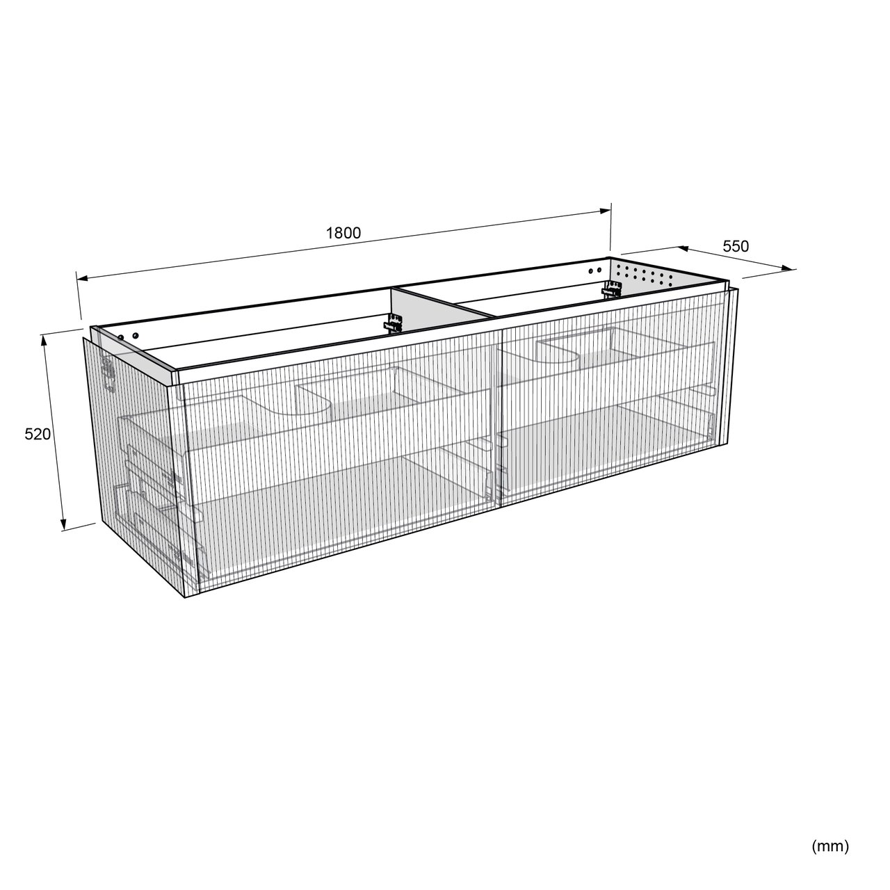 Le meuble de salle de bains fait 180 cm de large et il est fabrique en MDF laqué.