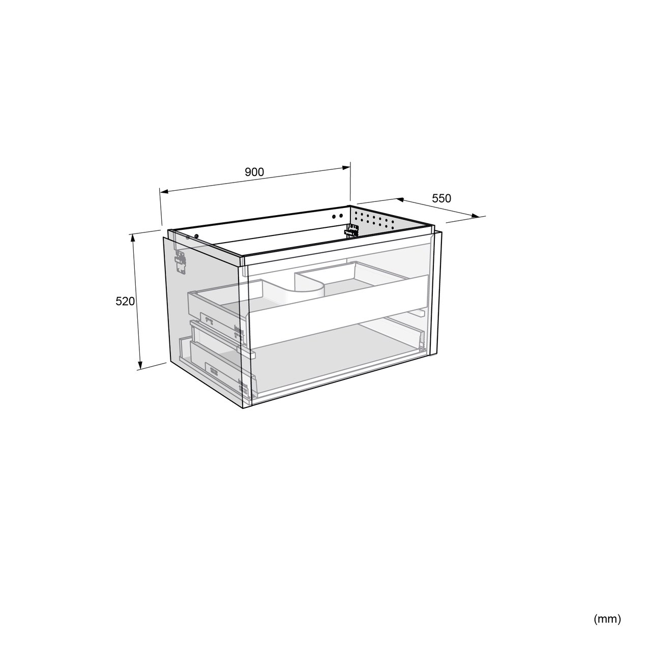 Le meuble de salle de bains fait 90 cm de large et il est fabrique en MDF laqué.