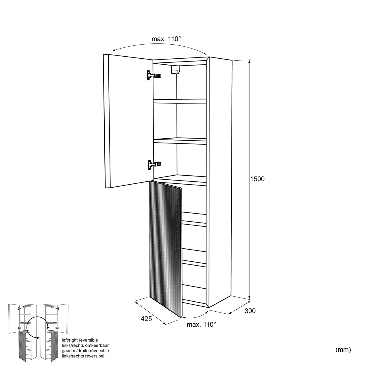 Cette armoire de salle de bains de qualité supérieure en chêne naturel avec 2 portes a une largeur de 42 cm, une hauteur de 150 cm et une profondeur de 30 cm. Cette armoire suspendue en chêne naturel s'intègre dans toute salle de bain grâce à sa finition élégante.