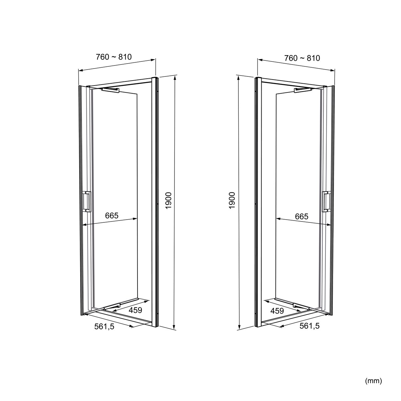 Cette porte de douche en niche mesure 80 cm de large et 190 cm de haut.