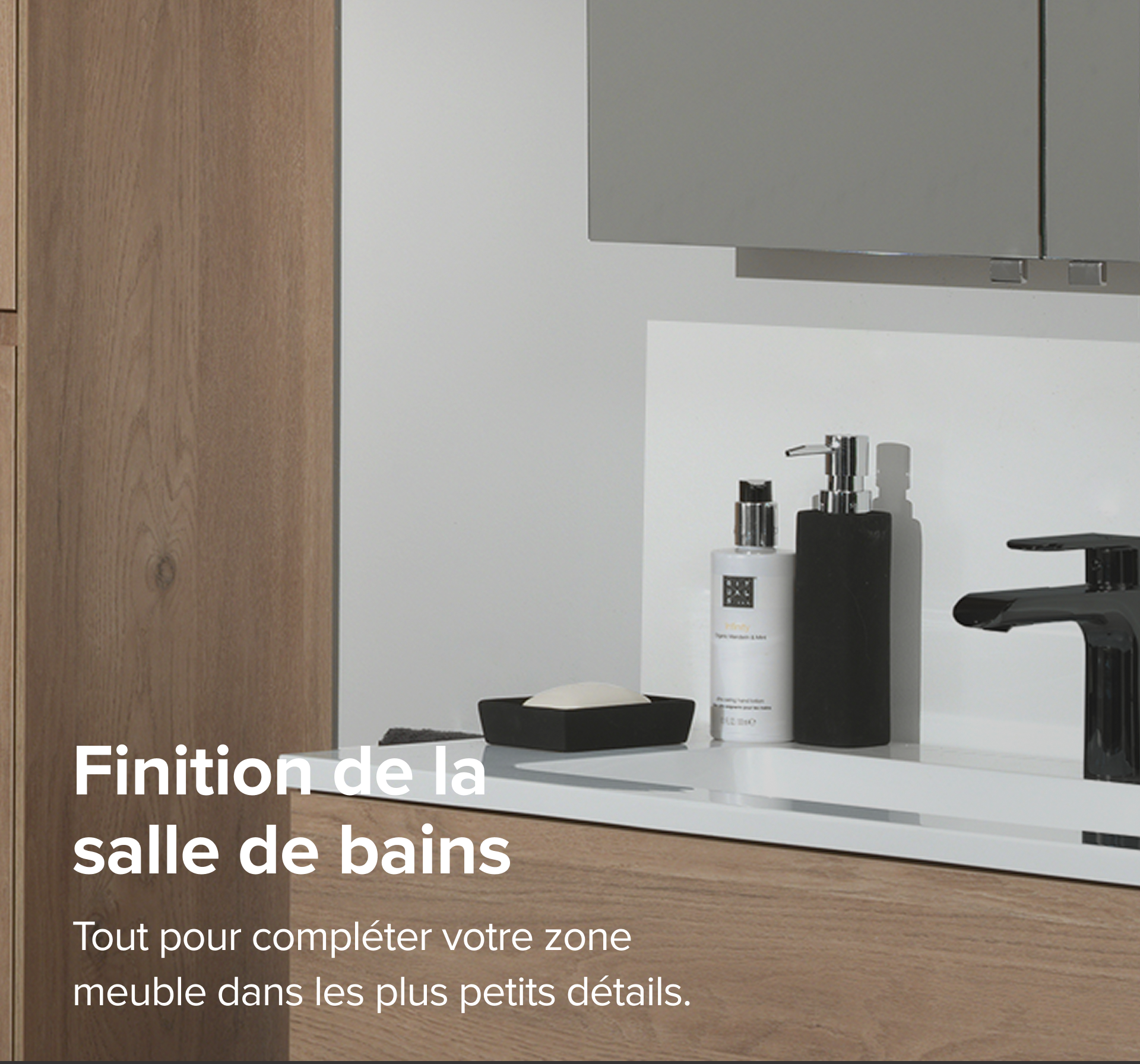 Une salle de bains élégante commence par le meuble, mais c’est la finition qui fait toute la différence. Découvrez ici tout ce qui complète parfaitement votre zone meuble : des colonnes et armoires de toilette pratiques à l’éclairage d’ambiance et aux crédences faciles d’entretien. Vous trouverez également ici les éléments techniques de sanitaire. Ainsi, votre salle de bains ne sera pas seulement belle à regarder, mais aussi parfaitement fonctionnelle. Jusqu’au moindre détail !
