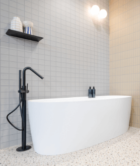 Une salle de bain qui prouve que le gris peut être vibrant et inspirant, un équilibre parfait entre design, modernité et engagement écologique.