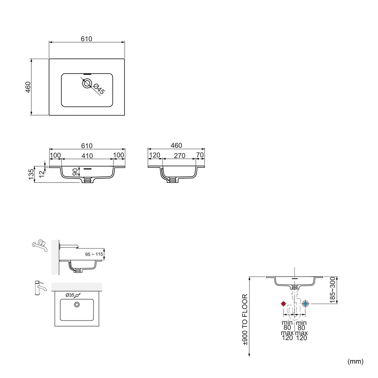 Ce lavabo est également disponible en d'autres dimensions et en version hauteur de rebord de 9 cm.
