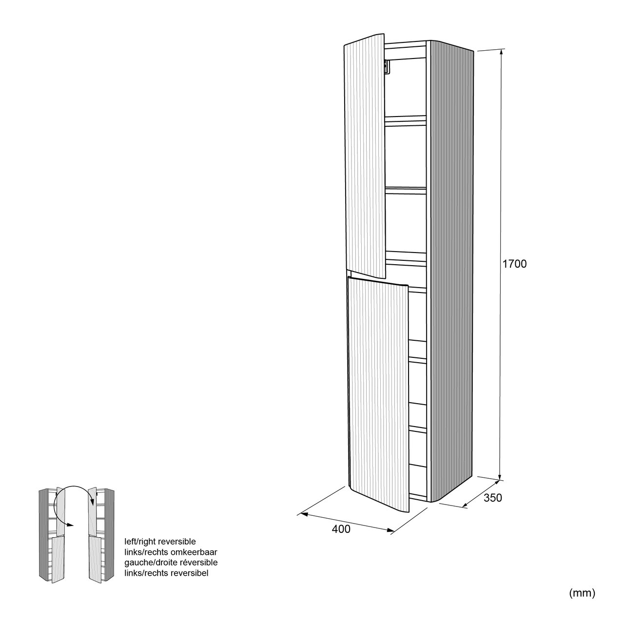 Cette superbe colonne salle de bains en MDF avec feuille PVC avec 2 portes a une largeur de 40 cm, une hauteur de 170 cm et une profondeur de 35 cm. Cette armoire représentent un véritable "eyecatcher" de votre nouvelle salle de bains et ont un caractère unique grâce aux coins arrondis. Ce meuble fait tout à fait partie des nouvelles tendances en salle de bains.
