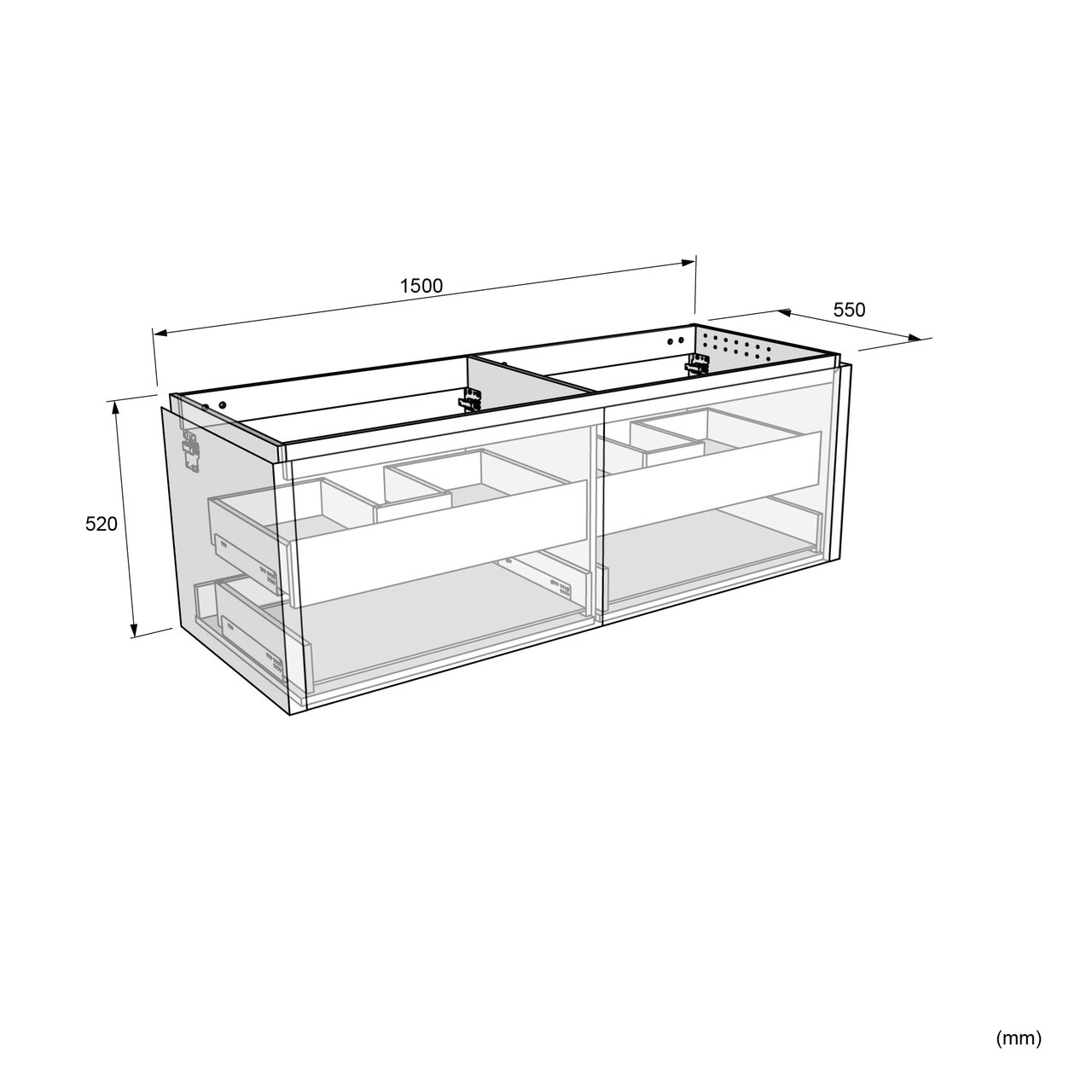 Het badkamermeubel van 150 cm breed is gemaakt van Massief hout.