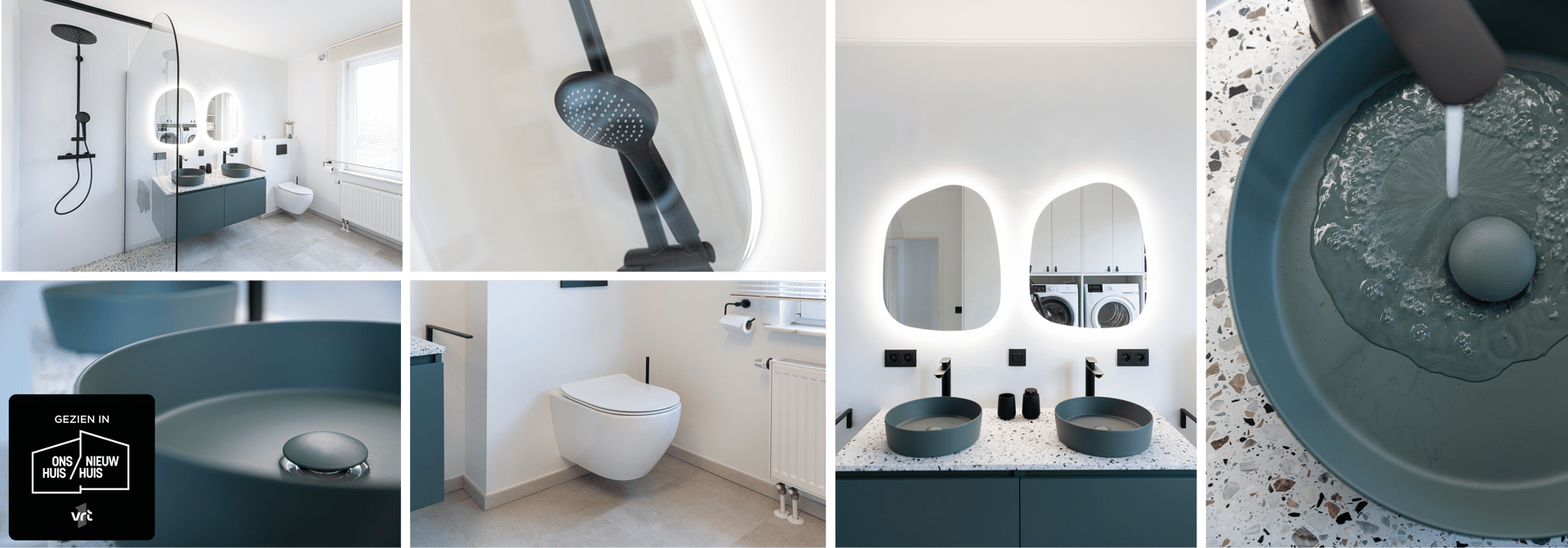 Een badkamer die rust en karakter uitstraalt. De combinatie van speels terrazzo, zachte groentinten en strakke zwarte accenten creëert een evenwichtige en eigentijdse sfeer. Organische spiegels met subtiele verlichting maken het geheel compleet.