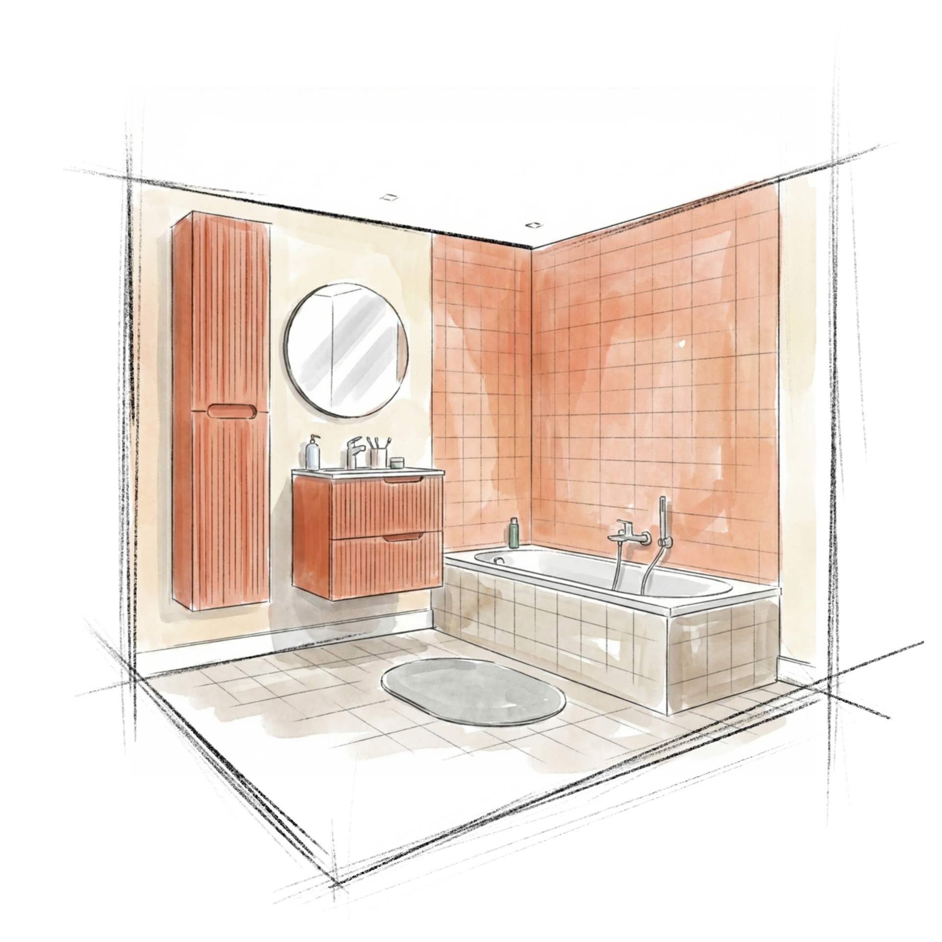 Het Linie Ribbo badkamermeubel in kleur cotto steelt meteen de show. De verticale ribbelstructuur en warme terracottatint brengen instant sfeer en geven de ruimte een unieke uitstraling. In combinatie met de Linie Vano wastafel ontstaat een strak en harmonieus geheel. De Linie Vivor badkamerspiegel met zwarte rand zorgt voor een subtiel contrast en past perfect binnen het geheel. Minimalistisch, maar net dat tikkeltje extra.