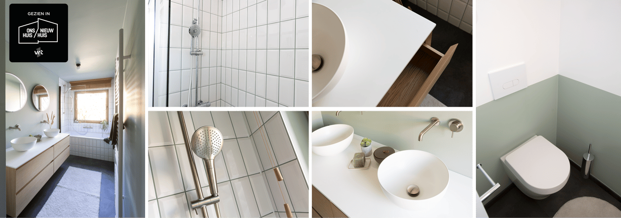 Deze badkamer straalt rust uit dankzij het gebruik van zachte groentinten, wit en lichte houtaccenten. Het kleurenpalet geeft de ruimte een frisse, luchtige uitstraling, terwijl het minimalistische ontwerp zorgt voor een gevoel van openheid. Ronde spiegels en opbouwkommen brengen zachtheid in de lijnen, terwijl de witte vierkante tegels een subtiele knipoog geven naar retro keramiek. Alles klopt: van de ingetogen kleuren tot de strakke indeling.