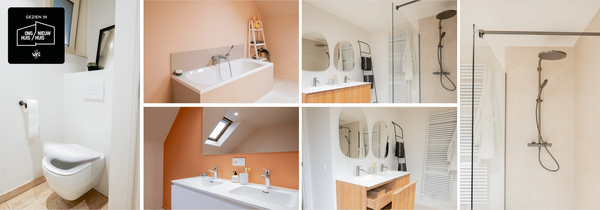 Een badkamer die rust en gezelligheid uitstraalt. De zachte aardetinten – van de zandkleurige tegels tot het warm oranje accentmuurtje – creëren een huiselijke sfeer. Het houten meubel met dubbele lavabo en afgeronde spiegels brengt warmte en elegantie, terwijl de ruime inloopdouche met zwarte regendouche zorgt voor een moderne toets.