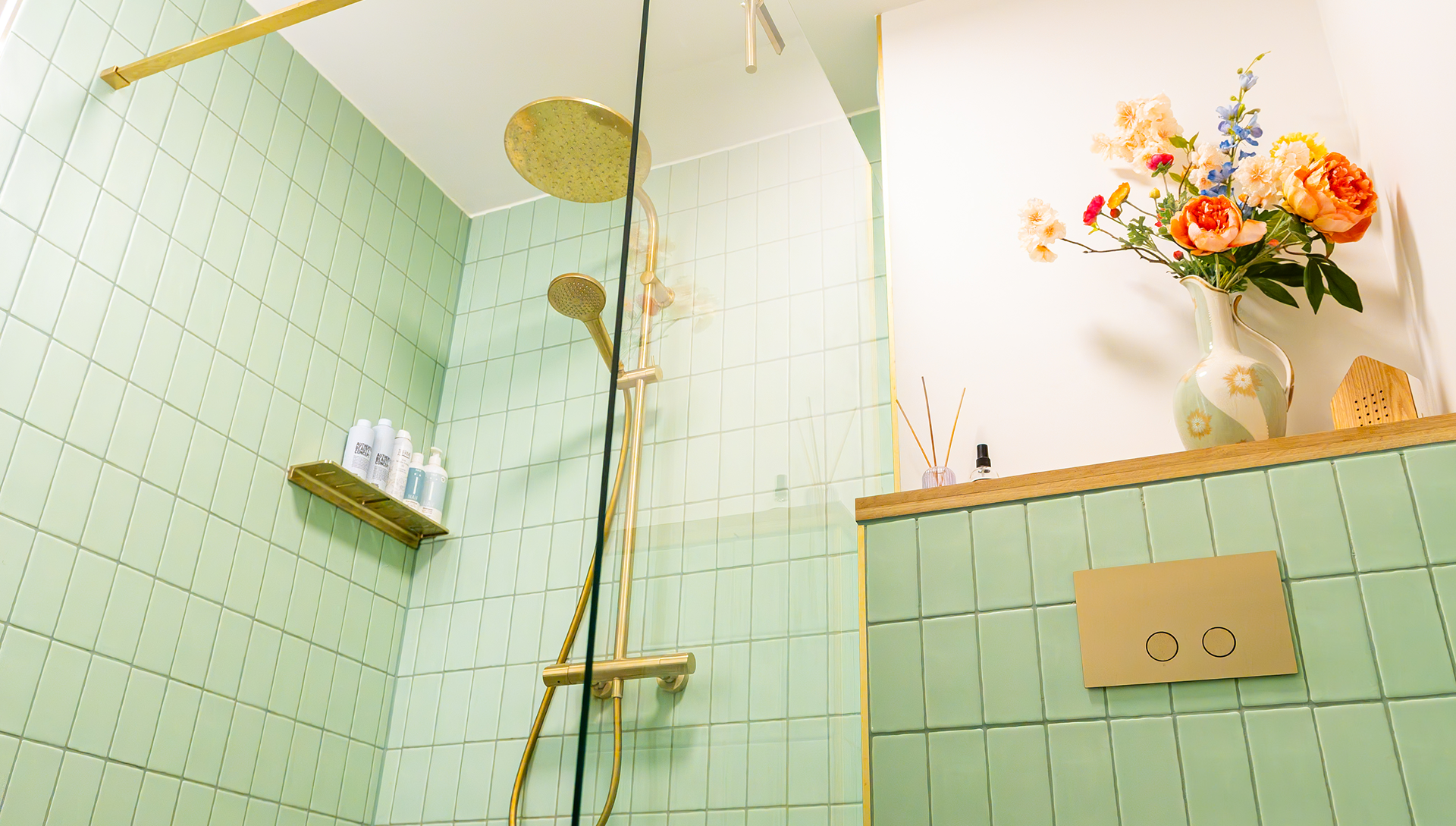 Deze badkamer straalt één en al karakter uit dankzij de zachtgroene wandtegels in retrostijl en de gouden accenten. De afgeronde waskom, het sculpturale meubel en het kraanwerk vormen samen een speelse maar stijlvolle mix. Elk detail klopt — van de nis in de douche tot de fijne afwerking van het ladefront.