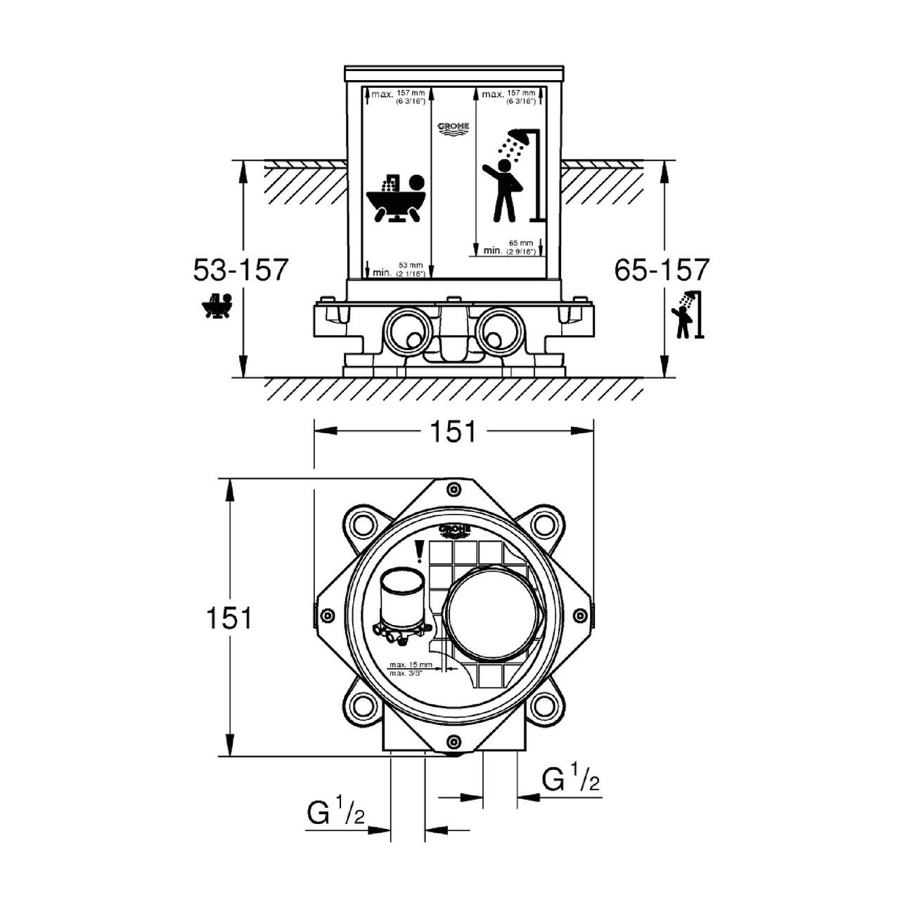 Dit artikel is een GROHE-inbouwdeel met bodemplaat voor vrijstaande badkranen. Dit inbouwdeel is geschikt voor baduitlopen en badmengkranen die aan de vloer gemonteerd worden. De bodemplaat kan horizontaal 360° en verticaal 3° versteld worden. De inbouwdiepte van dit deel is 53 tot 157 mm en de diepte-compensatie is 104 mm. Op dit inbouwdeel zitten twee 1/2”-aansluitingen, een voor koud water en een voor heet water.