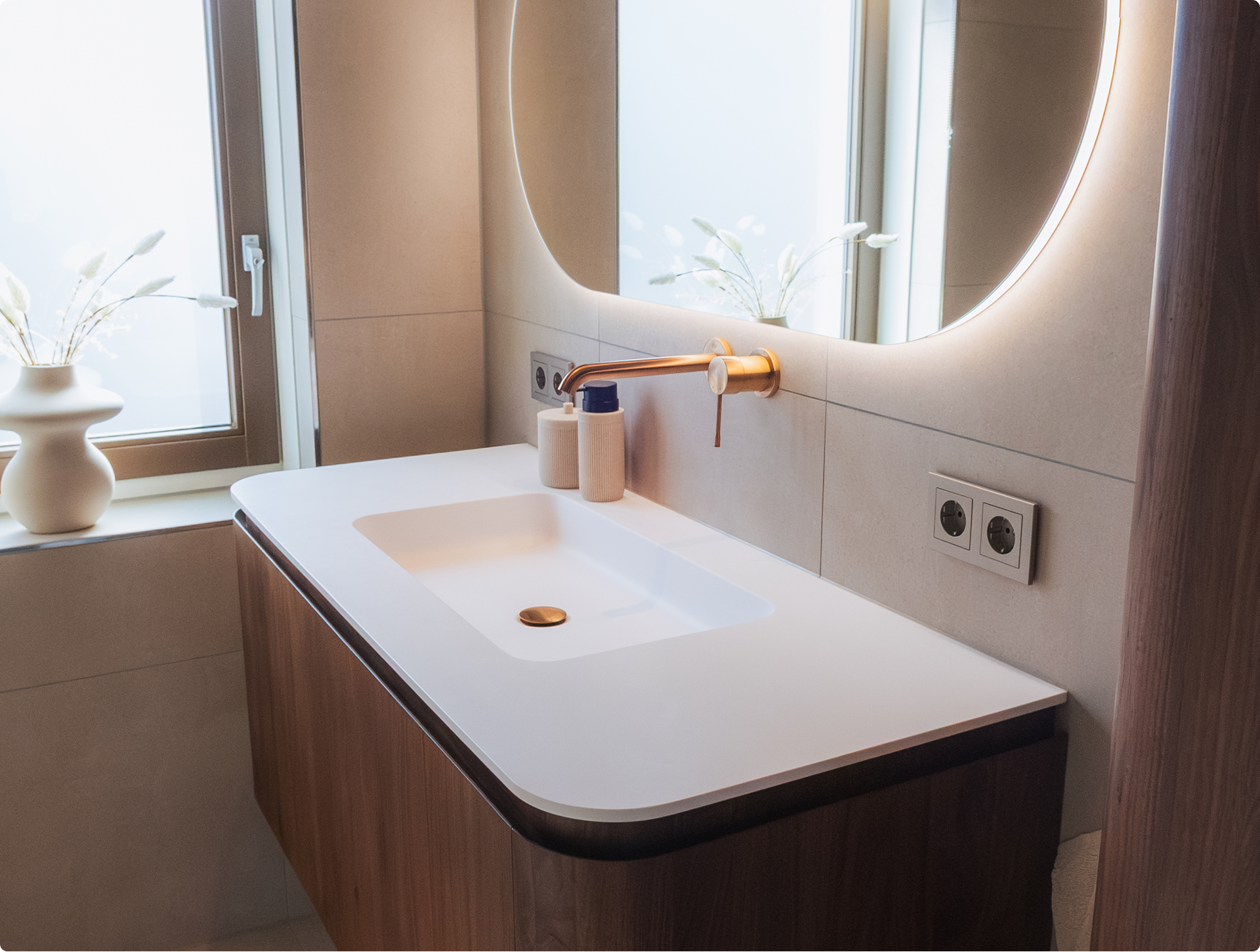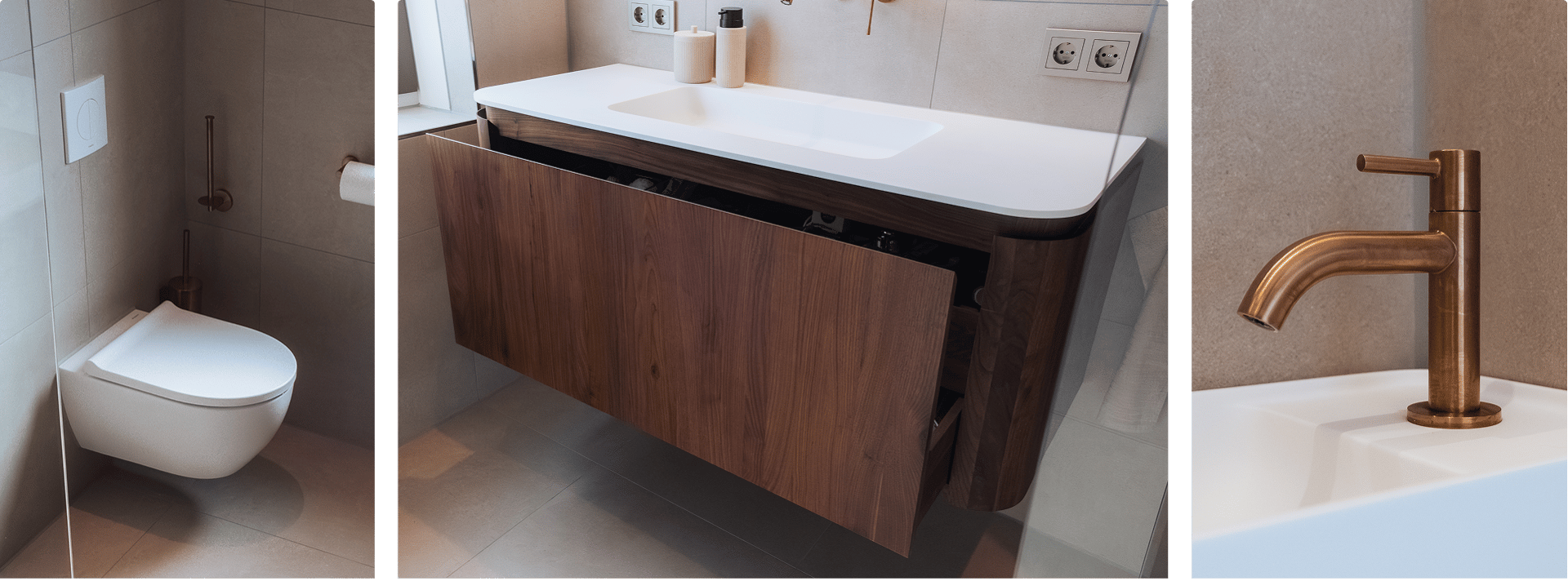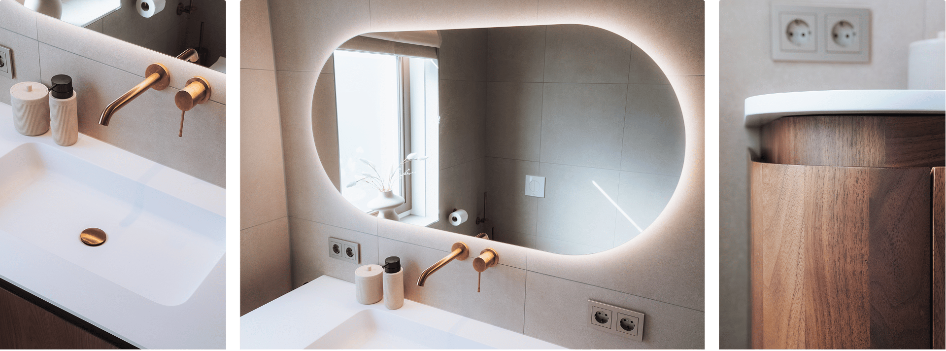 Dat Amanda smaak en stijl heeft, dat wisten wij al wel, maar wauw – deze badkamer is een parel van een ruimte geworden. Zodra je de deur opent, springt het massief notenhouten Balmani Moon badkamermeubel in het oog. De warmte van het notenhout werkt prachtig samen met de Brushed Warm Sunset inbouwkraan van Grohe. De Solid Surface wastafel (die net als het meubel afgeronde hoeken heeft) zorgt ervoor dat het meubel fris aan blijft voelen.