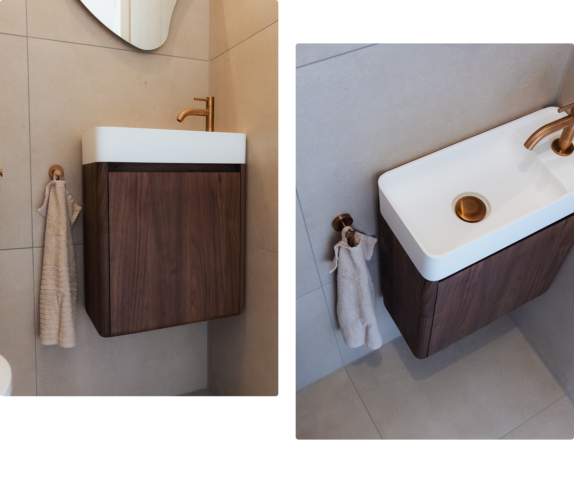 Het notenhout en de afgeronde hoeken? Die vinden we ook terug in het toilet op de begane grond. Het Balmani Fara fonteinkastje wordt ook hier gecombineerd met een Solid Surface wastafeltje en een Blaufoss Brushed Rose Gold koudwaterkraan. Een bijpassend roségoud handdoekhaakje van Blaufoss mag uiteraard niet ontbreken...