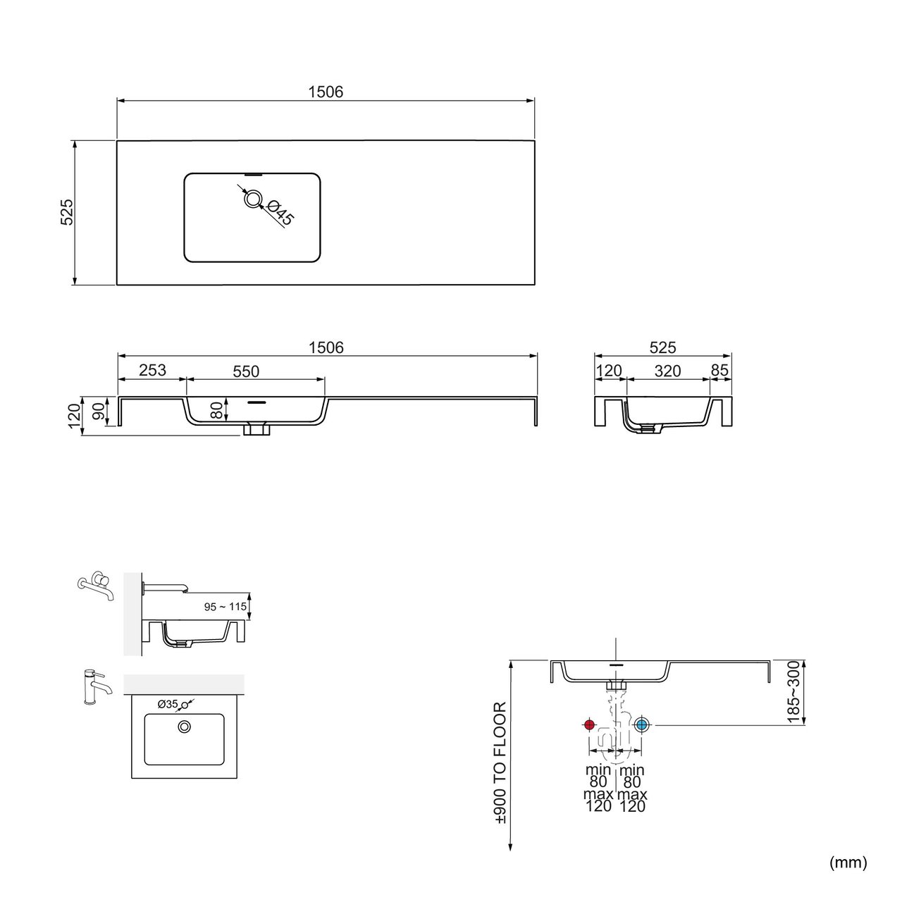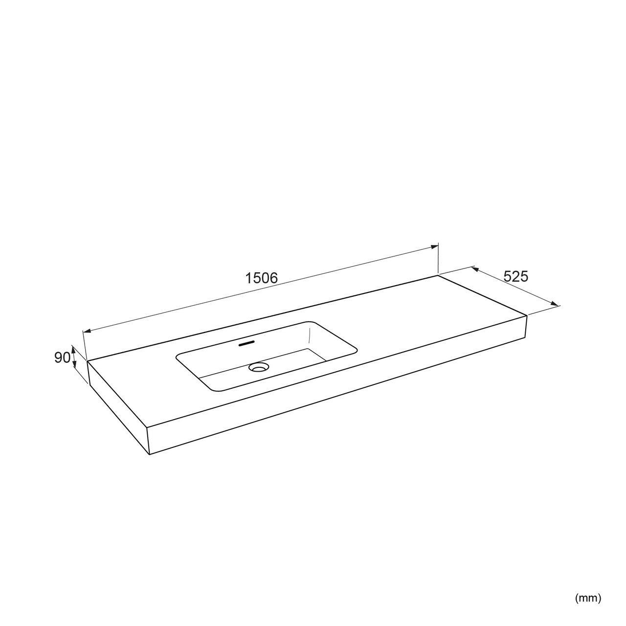 Deze asymmetrische Solid Surface wastafel met geïntegreerde waskom heeft een breedte van 150 cm, een diepte van 52 cm en een randhoogte van 9 cm. Deze mat witte wastafel past in elke badkamer door zijn elegante afwerking.