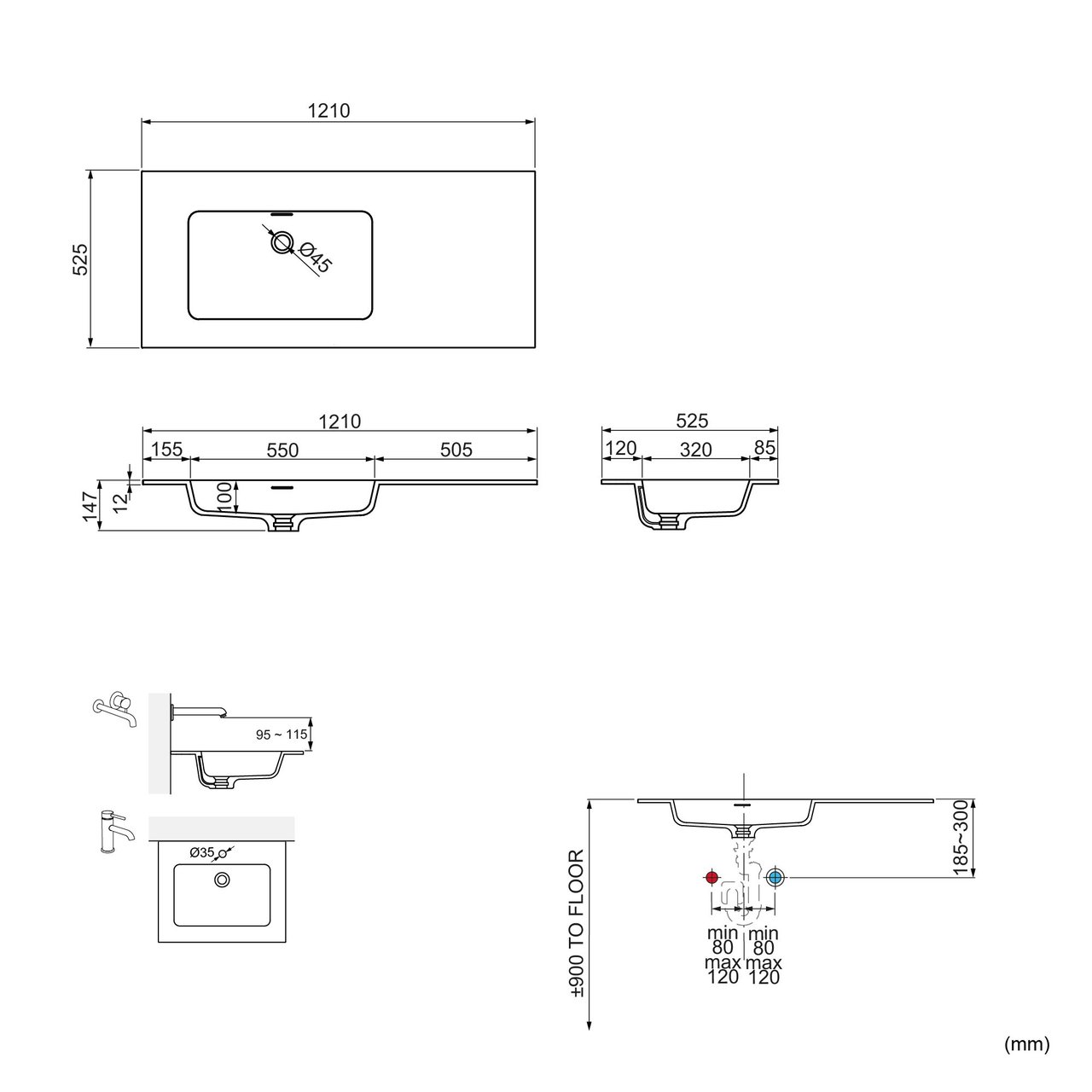 Deze wastafel is ook beschikbaar in andere afmetingenen in een variant met randhoogte 9 cm.