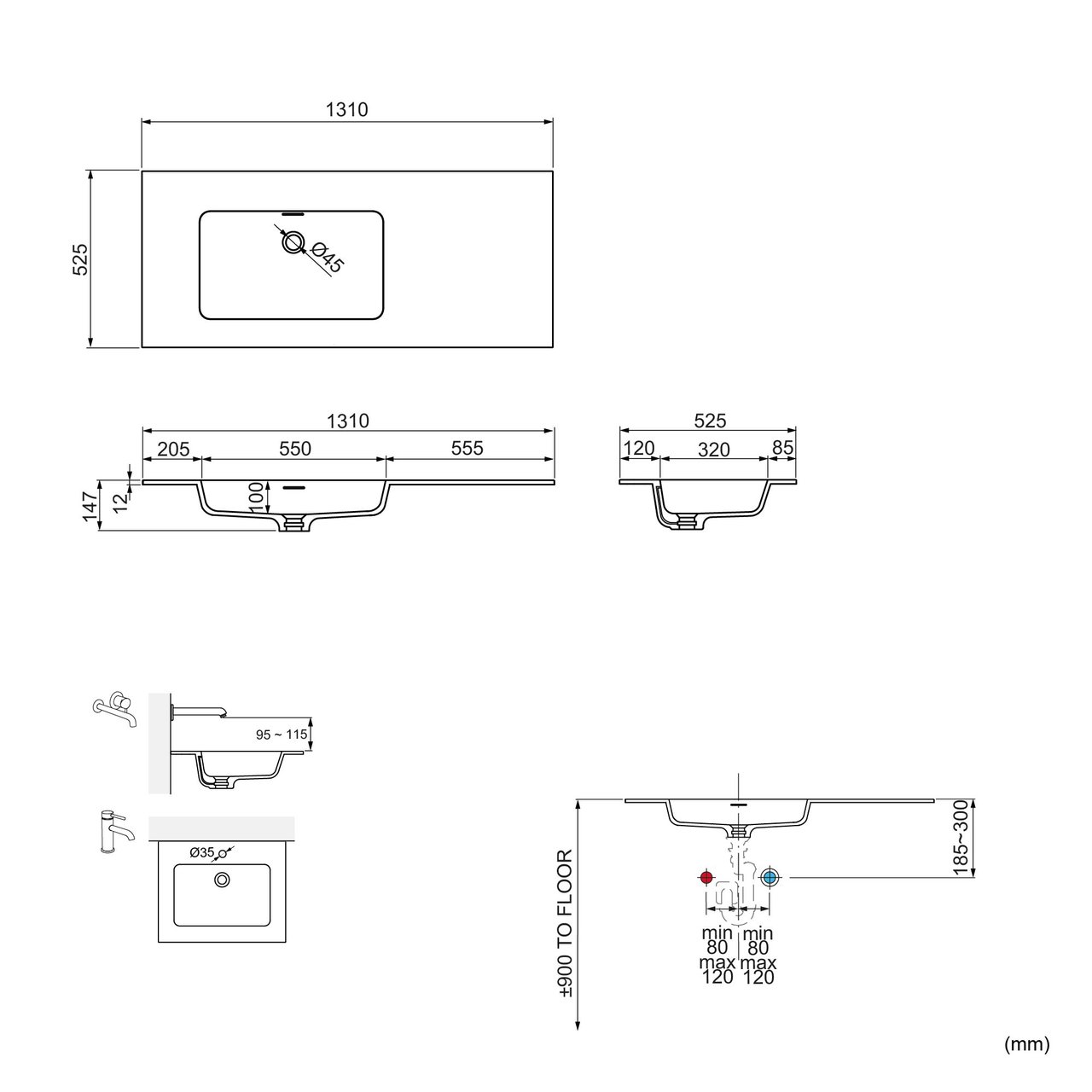 | Afmetingen | 130 x 52 cm asymmetrisch links combinatie kast 35 cm | |