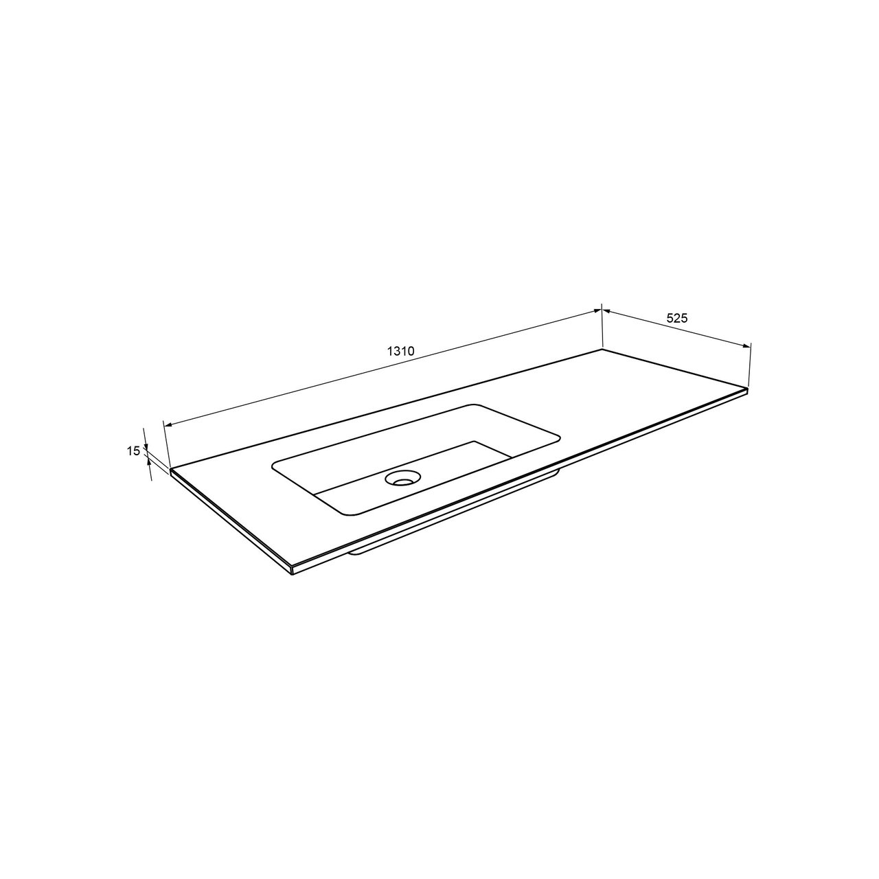 Deze asymmetrische kwarts wastafel met geïntegreerde waskom heeft een breedte van 130 cm, een diepte van 52 cm en een randhoogte van 1,5 cm. Deze mat zwarte wastafel past in elke badkamer door zijn strakke afwerking.