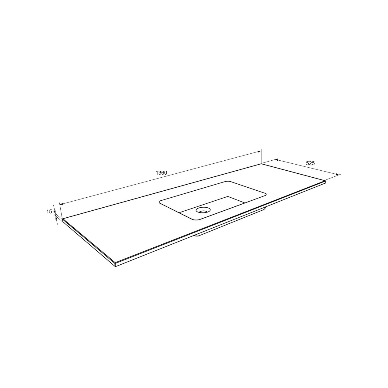 Deze kwarts wastafel met geïntegreerde waskom heeft een breedte van 135 cm, een diepte van 52 cm en een randhoogte van 1,5 cm. Deze mat zwarte wastafel past in elke badkamer door zijn strakke afwerking.