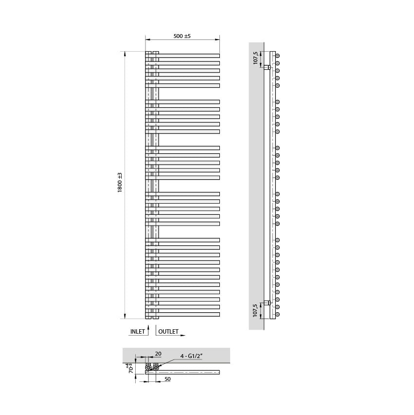 Deze radiator met ronde buizen heeft een breedte van 50 cm en een hoogte van 180 cm. De Glanzend Witte radiator past in elke badkamer door zijn frisse afwerking.
